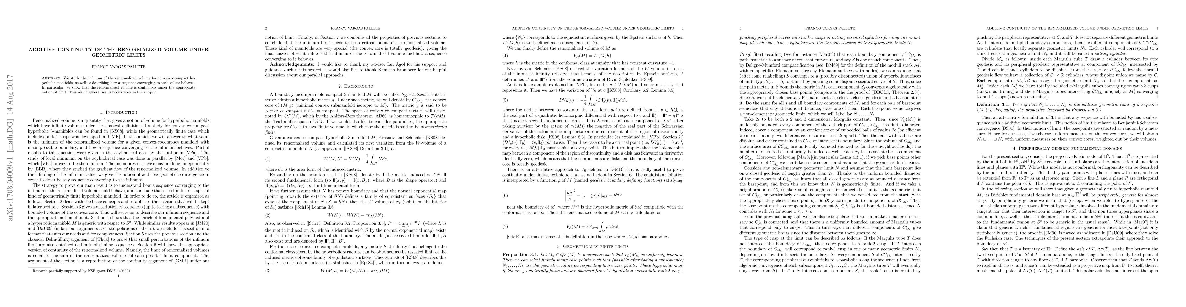 We study the infimum of the renormalized volume for convex-cocompact hyperbolic manifolds, as well as describing how a sequence converging to such values behaves. In particular, we show that the renormalized volume is continuous under the appropriate notion of limit. This result generalizes previous work in the subject.