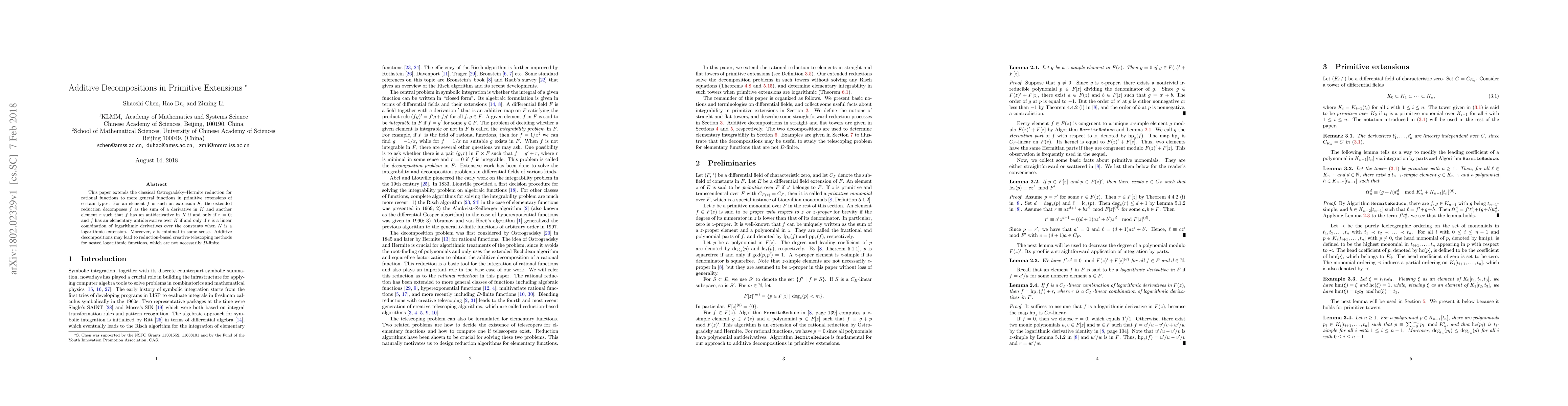 This paper extends the classical Ostrogradsky-Hermite reduction for rational functions to more general functions in primitive extensions of certain types. For an element $f$ in such an extension $K$, the extended reduction decomposes $f$ as the sum of a derivative in $K$ and another element $r$ such that $f$ has an antiderivative in $K$ if and only if $r=0$; and $f$ has an elementary antiderivative over $K$ if and only if $r$ is a linear combination of logarithmic derivatives over the constants when $K$ is a logarithmic extension. Moreover, $r$ is minimal in some sense. Additive decompositions may lead to reduction-based creative-telescoping methods for nested logarithmic functions, which are not necessarily $D$-finite.
