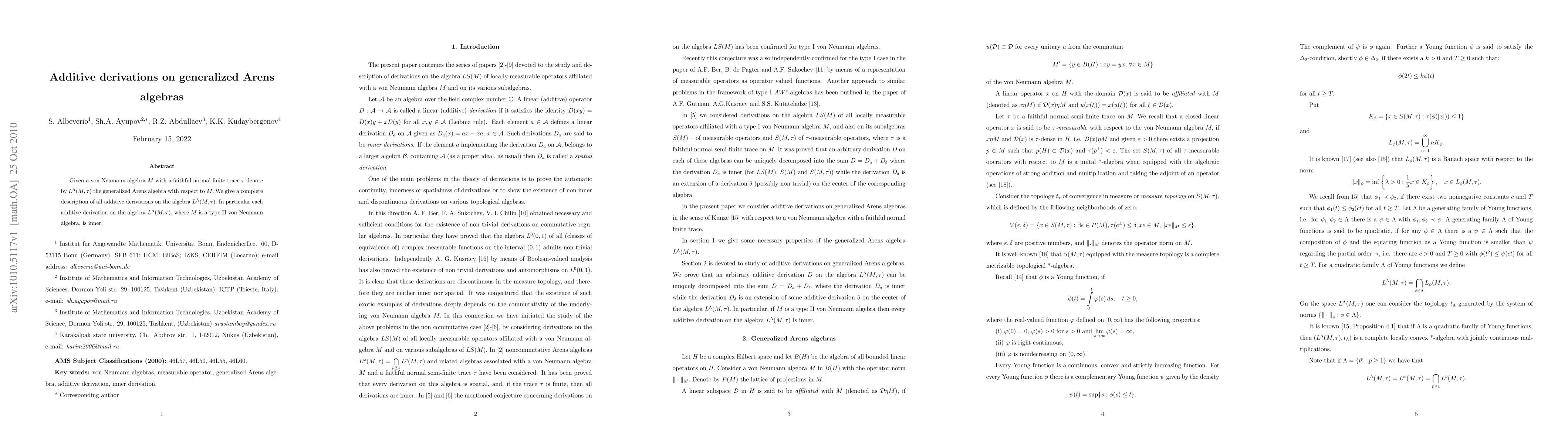 Given a von Neumann algebra $M$ with a faithful normal finite trace $\tau$ denote by $L^\Lambda(M, \tau)$ the generalized Arens algebra with respect to $M.$ We give a complete description of all additive derivations on the algebra $L^\Lambda(M, \tau).$ In particular each additive derivation on the algebra $L^{\Lambda}(M, \tau),$ where $M$ is a type II von Neumann algebra, is inner.