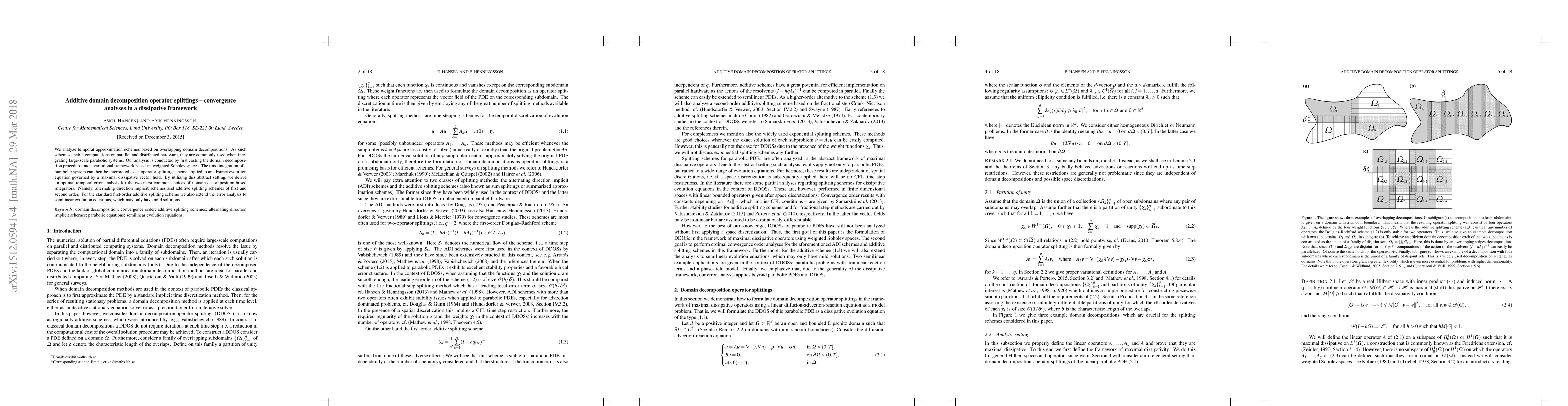 We analyze temporal approximation schemes based on overlapping domain decompositions. As such schemes enable computations on parallel and distributed hardware, they are commonly used when integrating large-scale parabolic systems. Our analysis is conducted by first casting the domain decomposition procedure into a variational framework based on weighted Sobolev spaces. The time integration of a parabolic system can then be interpreted as an operator splitting scheme applied to an abstract evolution equation governed by a maximal dissipative vector field. By utilizing this abstract setting, we derive an optimal temporal error analysis for the two most common choices of domain decomposition based integrators. Namely, alternating direction implicit schemes and additive splitting schemes of first and second order. For the standard first-order additive splitting scheme we also extend the error analysis to semilinear evolution equations, which may only have mild solutions.