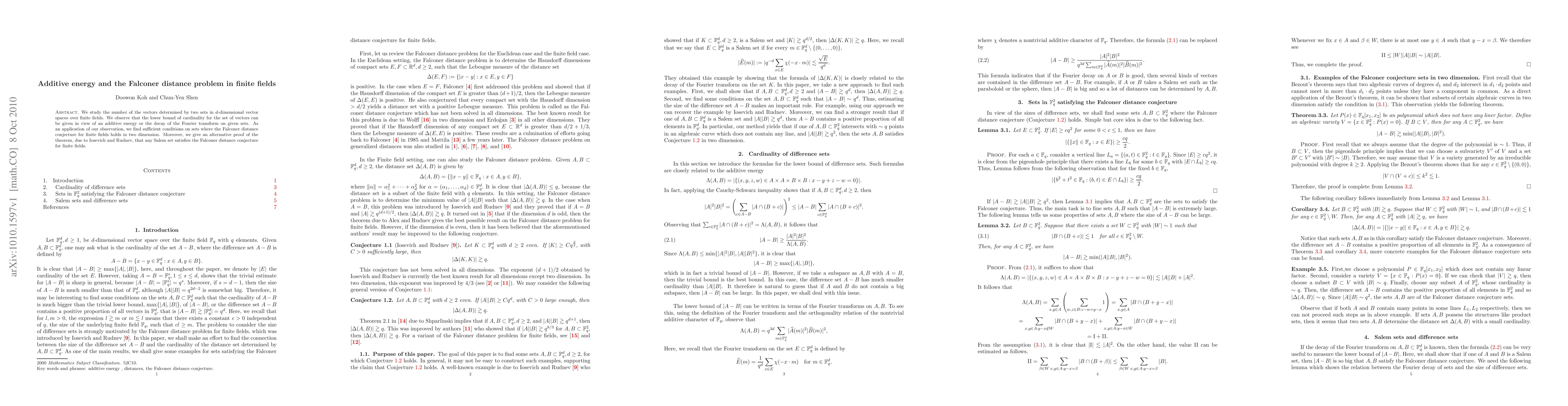 This paper explores the relationship between additive energy and the Falconer distance problem in finite fields, establishing lower bounds for vector cardinality and proving the Falconer distance conjecture in two dimensions under certain conditions. An alternative proof for the conjecture's validity in Salem sets is also provided.