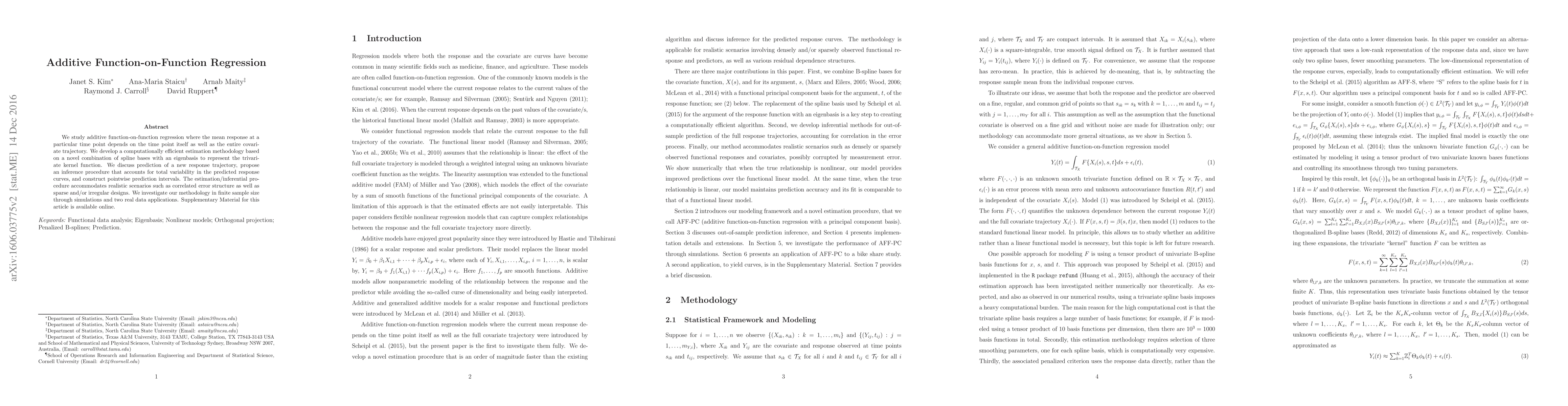 This paper develops a computationally efficient method for additive function-on-function regression, combining spline bases with an eigenbasis to represent the trivariate kernel function. It also proposes prediction and inference procedures, validated through simulations and real data applications.