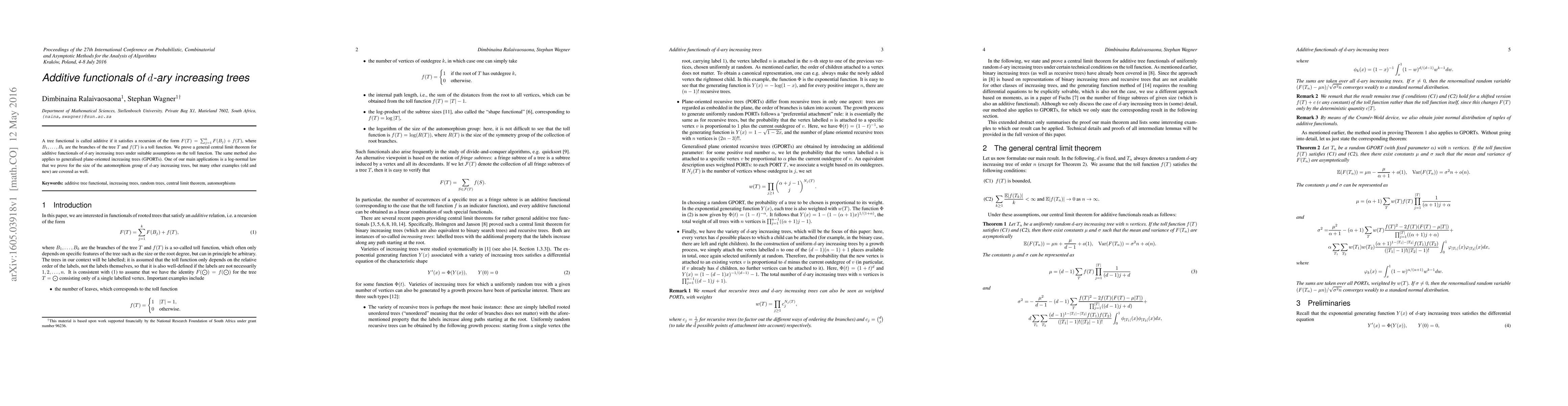 This paper proves a central limit theorem for additive functionals of $d$-ary increasing trees, extending the method to generalised plane-oriented increasing trees. It also demonstrates a log-normal law for the size of the automorphism group of $d$-ary increasing trees as a key application.