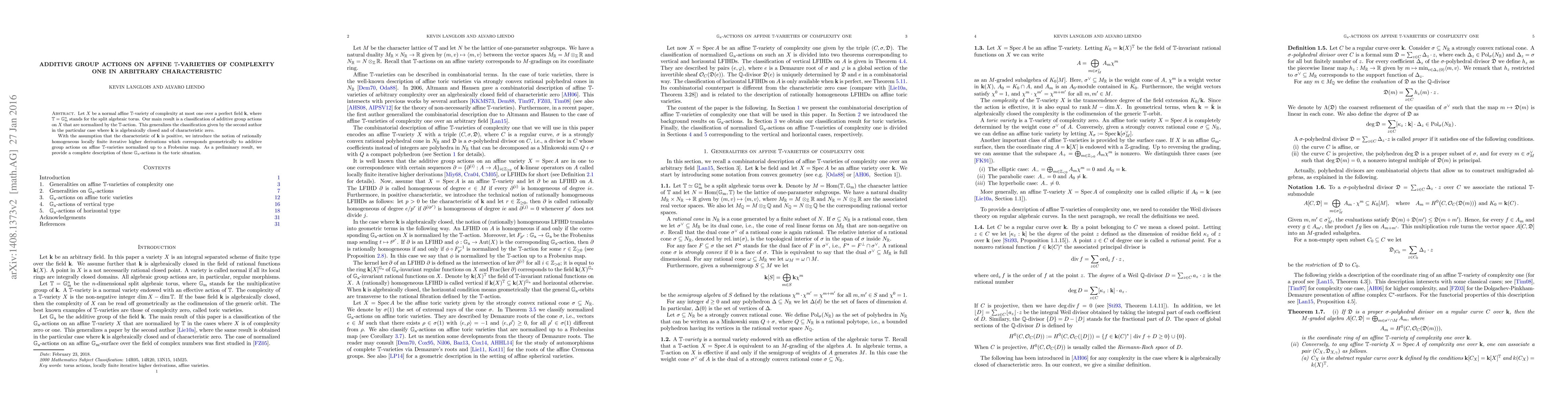 This paper classifies additive group actions on normal affine T-varieties of complexity one over a perfect field k, normalized by the T-action. It extends previous classifications in characteristic zero to arbitrary characteristics, introducing new notions for positive characteristic cases.