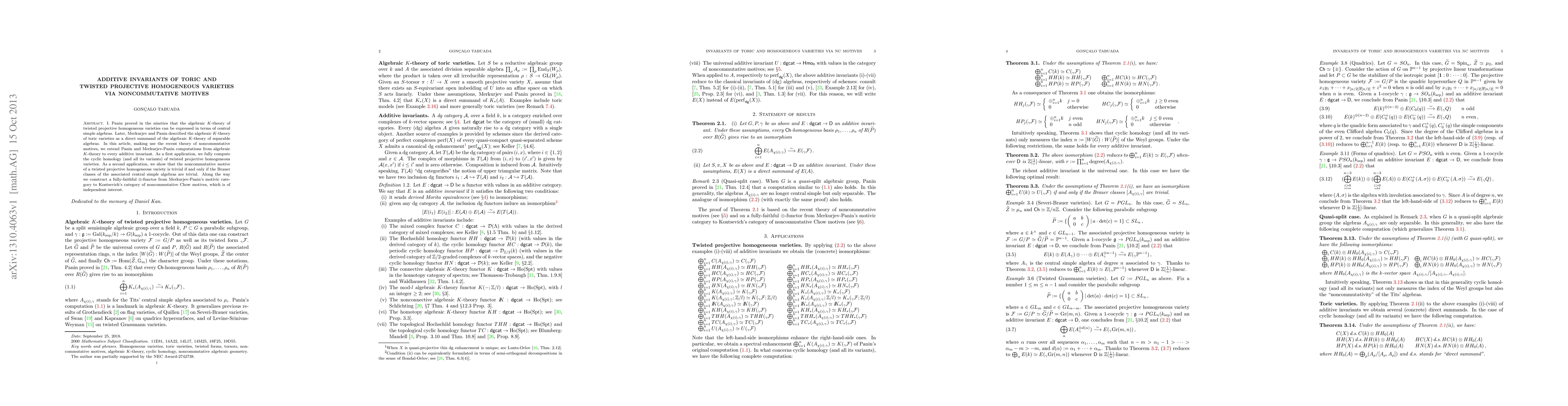 I. Panin proved in the nineties that the algebraic K-theory of twisted projective homogeneous varieties can be expressed in terms of central simple algebras. Later, Merkurjev and Panin described the algebraic K-theory of toric varieties as a direct summand of the algebraic K-theory of separable algebras. In this article, making use of the recent theory of noncommutative motives, we extend Panin and Merkurjev-Panin computations from algebraic K-theory to every additive invariant. As a first application, we fully compute the cyclic homology (and all its variants) of twisted projective homogeneous varieties. As a second application, we show that the noncommutative motive of a twisted projective homogeneous variety is trivial if and only if the Brauer classes of the associated central simple algebras are trivial. Along the way we construct a fully-faithful tensor functor from Merkurjev-Panin's motivic category to Kontsevich's category of noncommutative Chow motives, which is of independent interest.