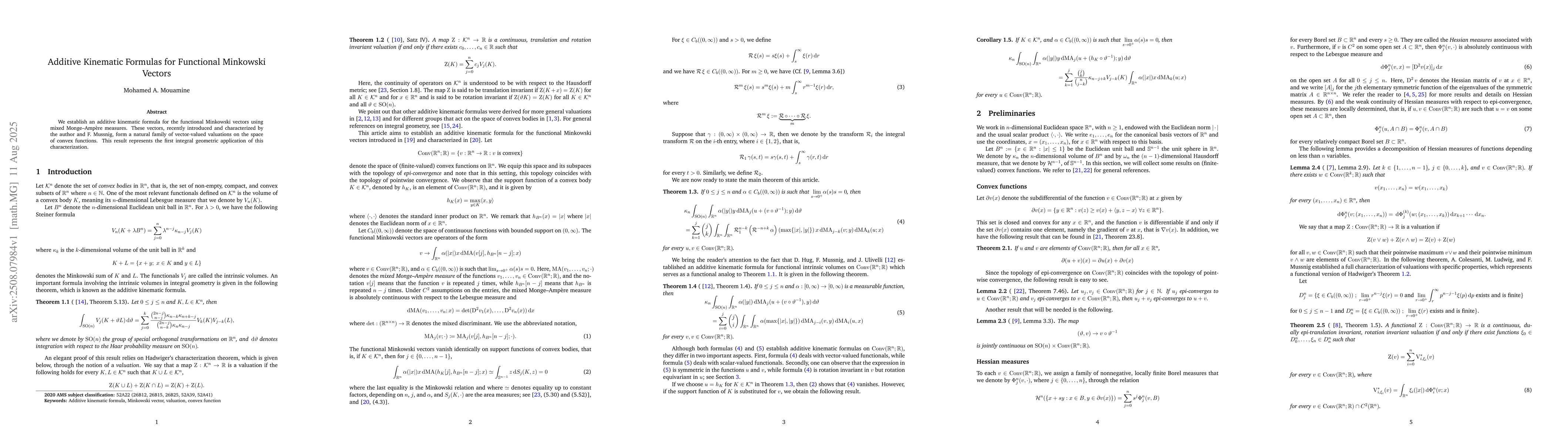 We establish an additive kinematic formula for the functional Minkowski vectors using mixed Monge-Amp\`ere measures. These vectors, recently introduced and characterized by the author and F. Mussnig, form a natural family of vector-valued valuations on the space of convex functions. This result represents the first integral geometric application of this characterization.