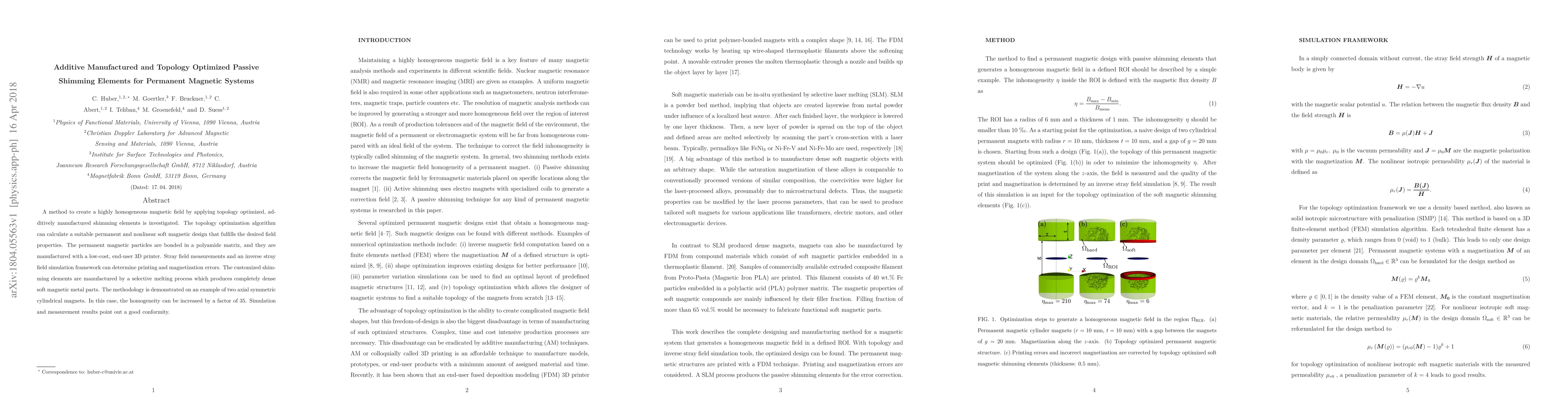 A method to create a highly homogeneous magnetic field by applying topology optimized, additively manufactured shimming elements is investigated. The topology optimization algorithm can calculate a suitable permanent and nonlinear soft magnetic design that fulfills the desired field properties. The permanent magnetic particles are bonded in a polyamide matrix, and they are manufactured with a low-cost, end-user 3D printer. Stray field measurements and an inverse stray field simulation framework can determine printing and magnetization errors. The customized shimming elements are manufactured by a selective melting process which produces completely dense soft magnetic metal parts. The methodology is demonstrated on an example of two axial symmetric cylindrical magnets. In this case, the homogeneity can be increased by a factor of 35. Simulation and measurement results point out a good conformity.