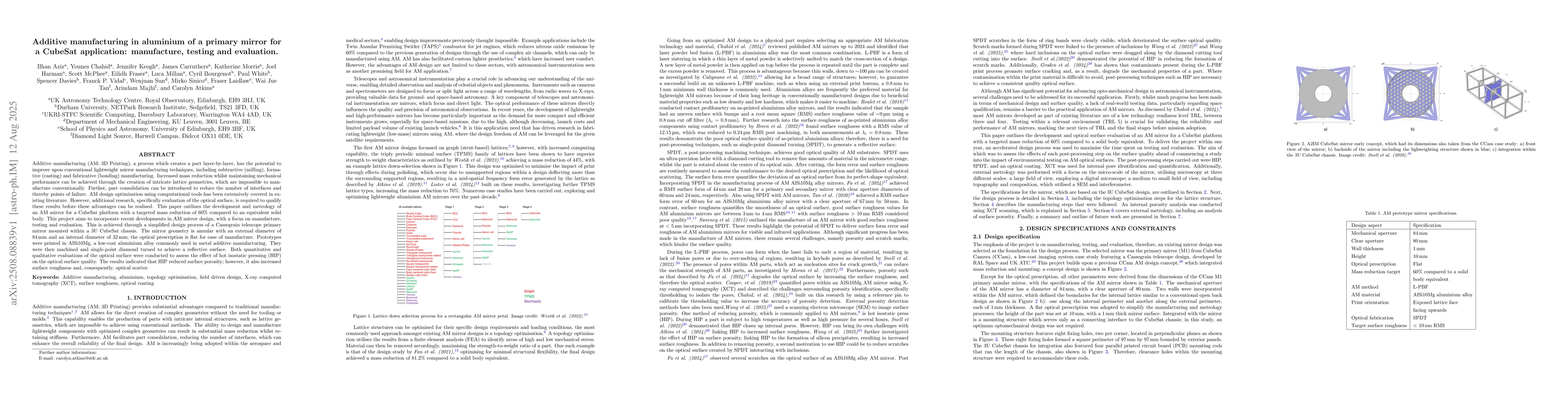 Additive manufacturing (AM; 3D Printing), a process which creates a part layer-by-layer, has the potential to improve upon conventional lightweight mirror manufacturing techniques, including subtractive (milling), formative (casting) and fabricative (bonding) manufacturing. Increased mass reduction whilst maintaining mechanical performance can be achieved through the creation of intricate lattice geometries, which are impossible to manufacture conventionally. Further, part consolidation can be introduced to reduce the number of interfaces and thereby points of failure. AM design optimisation using computational tools has been extensively covered in existing literature. However, additional research, specifically evaluation of the optical surface, is required to qualify these results before these advantages can be realised. This paper outlines the development & metrology of an AM mirror for a CubeSat platform with a targeted mass reduction of 60% compared to an equivalent solid body. This project aims to incorporate recent developments in AM mirror design, with a focus on manufacture, testing & evaluation. This is achieved through a simplified design process of a Cassegrain telescope primary mirror mounted within a 3U CubeSat chassis. The mirror geometry is annular with an external diameter of 84 mm and an internal diameter of 32 mm; the optical prescription is flat for ease of manufacture. Prototypes were printed in AlSi10Mg, a low-cost aluminium alloy commonly used in metal additive manufacturing. They were then machined and single-point diamond turned to achieve a reflective surface. Both quantitative & qualitative evaluations of the optical surface were conducted to assess the effect of hot isostatic pressing (HIP) on the optical surface quality. The results indicated that HIP reduced surface porosity; however, it also increased surface roughness and, consequently, optical scatter.