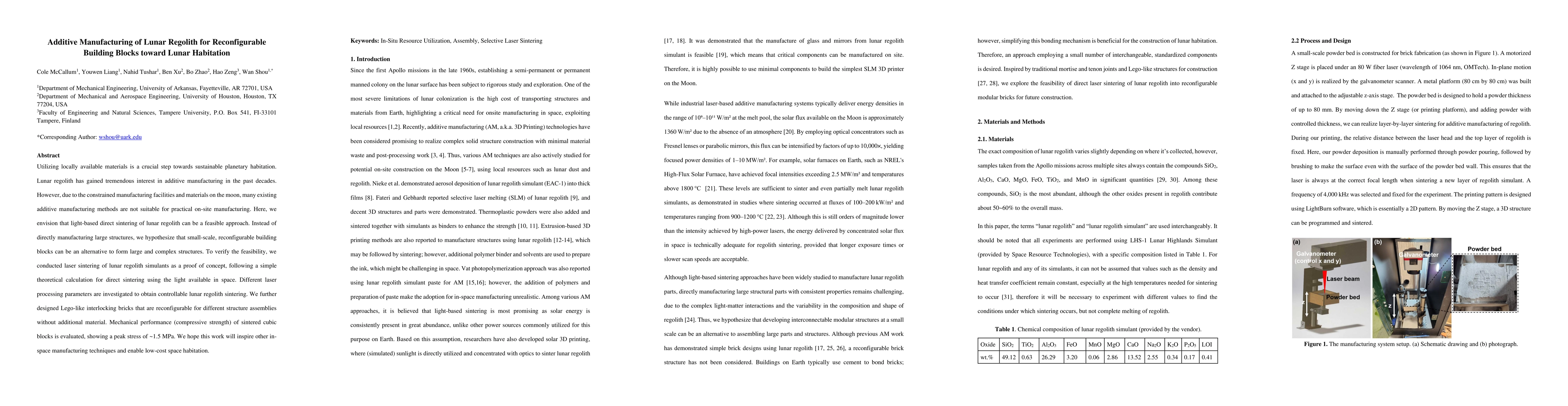 This study investigates a new method for 3D printing building blocks from lunar regolith using laser sintering, aiming to enable low-cost space habitation. The project successfully demonstrated the feasibility of this approach, with mechanical performance showing promise for future use in lunar construction.