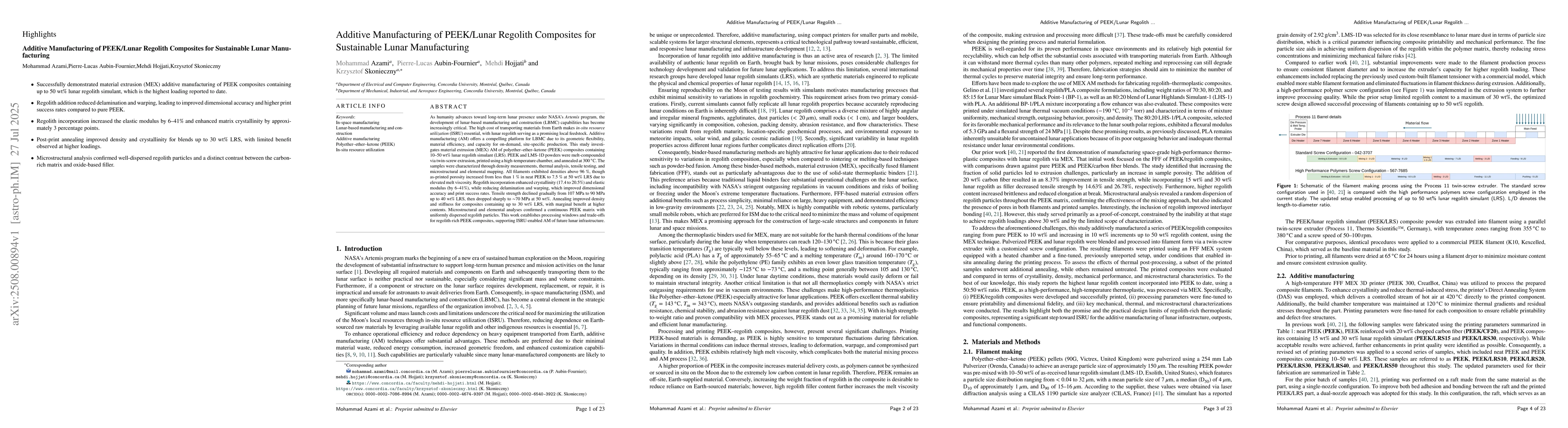 As humanity advances toward long-term lunar presence under NASA's Artemis program, the development of lunar-based manufacturing and construction (LBMC) capabilities has become increasingly critical. The high cost of transporting materials from Earth makes in-situ resource utilization (ISRU) essential, with lunar regolith serving as a promising local feedstock. Additive manufacturing (AM) offers a compelling platform for LBMC due to its geometric flexibility, material efficiency, and capacity for on-demand, site-specific production. This study investigates material extrusion (MEX) AM of polyether-ether-ketone (PEEK) composites containing 10 to 50 wt% lunar regolith simulant (LRS). PEEK and LMS-1D powders were melt-compounded via twin-screw extrusion, printed using a high-temperature chamber, and annealed at 300 degrees C. The samples were characterized through density measurements, thermal analysis, tensile testing, and microstructural and elemental mapping. All filaments exhibited densities above 96%, though as-printed porosity increased from less than 1% in neat PEEK to 7.5% at 50 wt% LRS due to elevated melt viscosity. Regolith incorporation enhanced crystallinity (17.4 to 20.5%) and elastic modulus (by 6-41%), while reducing delamination and warping, which improved dimensional accuracy and print success rates. Tensile strength declined gradually from 107 MPa to 90 MPa up to 40 wt% LRS, then dropped sharply to approximately 70 MPa at 50 wt%. Annealing improved density and stiffness for composites containing up to 30 wt% LRS, with marginal benefit at higher contents. Microstructural and elemental analyses confirmed a continuous PEEK matrix with uniformly dispersed regolith particles. This work establishes processing windows and trade-offs for regolith-rich PEEK composites, supporting ISRU-enabled AM of future lunar infrastructure.
