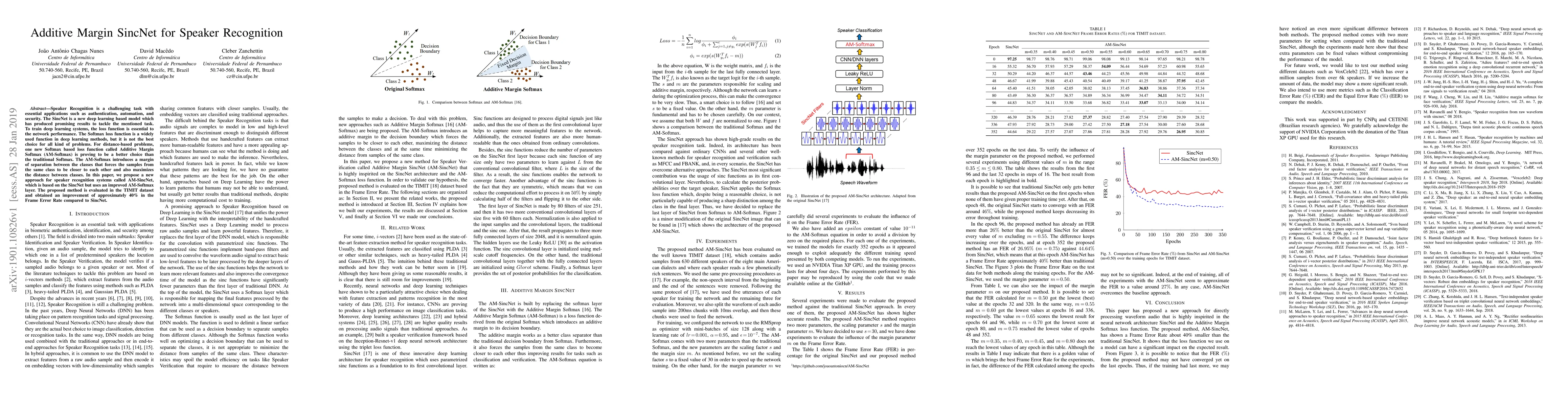 This paper proposes AM-SincNet, a speaker recognition model based on SincNet with an Additive Margin Softmax (AM-Softmax) loss function, achieving a 40% improvement in Frame Error Rate over SincNet on the TIMIT dataset. The AM-Softmax enhances class separation and intra-class cohesion.