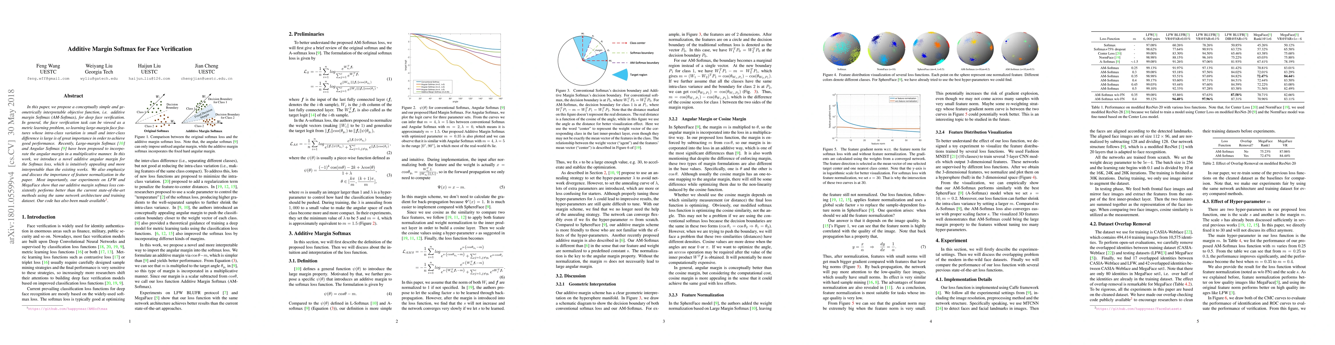 This paper proposes the additive margin Softmax (AM-Softmax) objective function for deep face verification, emphasizing its geometric interpretability and effectiveness over existing methods. Experiments on LFW, BLUFR, and MegaFace show AM-Softmax consistently outperforms current state-of-the-art methods.