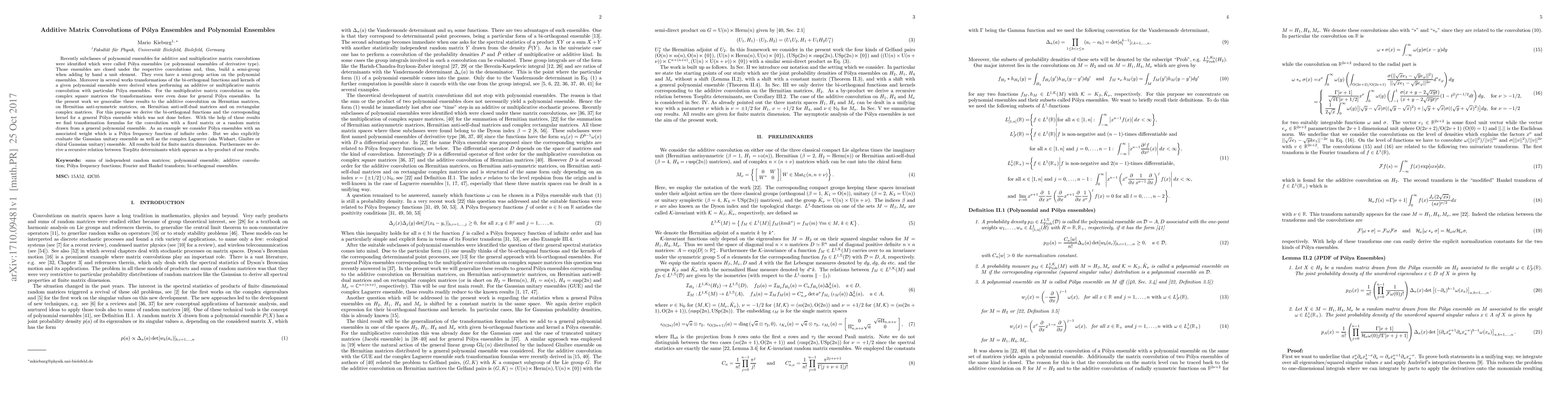 Recently subclasses of polynomial ensembles for additive and multiplicative matrix convolutions were identified which were called P\'olya ensembles (or polynomial ensembles of derivative type). Those ensembles are closed under the respective convolutions and, thus, build a semi-group when adding by hand a unit element. They even have a semi-group action on the polynomial ensembles. Moreover in several works transformations of the bi-orthogonal functions and kernels of a given polynomial ensemble were derived when performing an additive or multiplicative matrix convolution with particular P\'olya ensembles. For the multiplicative matrix convolution on the complex square matrices the transformations were even done for general P\'olya ensembles. In the present work we generalize these results to the additive convolution on Hermitian matrices, on Hermitian anti-symmetric matrices, on Hermitian anti-self-dual matrices and on rectangular complex matrices. For this purpose we derive the bi-orthogonal functions and the corresponding kernel for a general P\'olya ensemble which was not done before. With the help of these results we find transformation formulas for the convolution with a fixed matrix or a random matrix drawn from a general polynomial ensemble. As an example we consider P\'olya ensembles with an associated weight which is a P\'olya frequency function of infinite order. But we also explicitly evaluate the Gaussian unitary ensemble as well as the complex Laguerre (aka Wishart, Ginibre or chiral Gaussian unitary) ensemble. All results hold for finite matrix dimension. Furthermore we derive a recursive relation between Toeplitz determinants which appears as a by-product of our results.