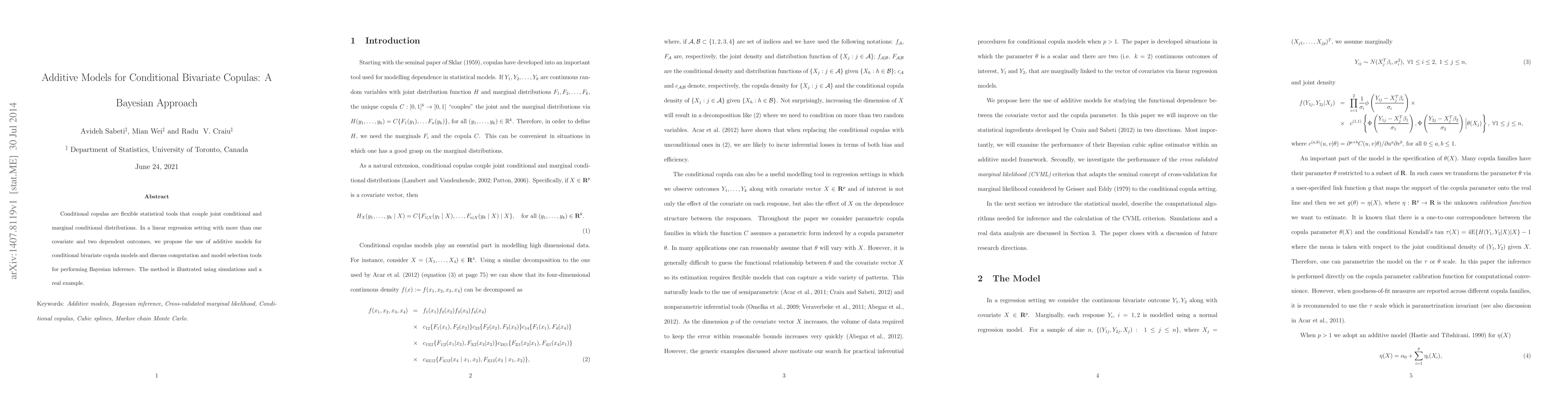 This paper proposes additive models for conditional bivariate copula models to flexibly couple joint and marginal distributions in linear regression settings with multiple covariates and two dependent outcomes. It discusses computational and model selection tools for Bayesian inference, illustrated through simulations and a real example.
