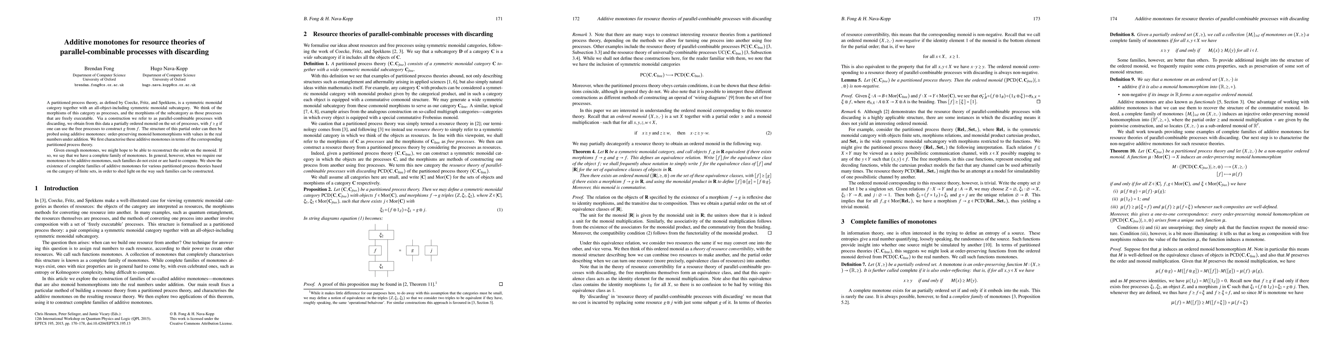 This paper explores additive monotones in the context of partitioned process theory, showing how they can be used to analyze the order of parallel-combinable processes with discarding. It proves the existence of complete families of additive monotones for specific partitioned process theories based on finite sets.