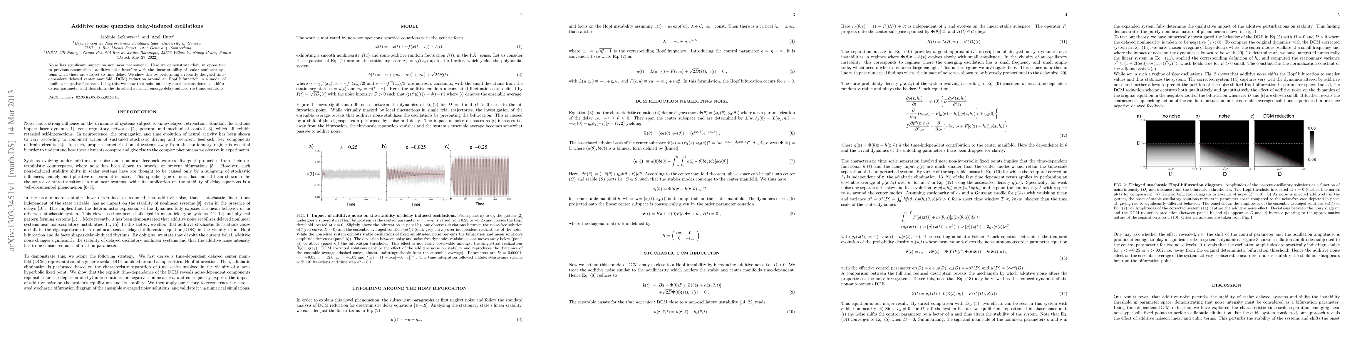This paper reveals that additive noise destabilizes time-delay induced oscillations in scalar nonlinear systems, contrary to previous assumptions. It demonstrates this through a time-dependent delayed center manifold reduction around a Hopf bifurcation in a nonlinear negative feedback model, showing that noise intensity acts as a bifurcation parameter.