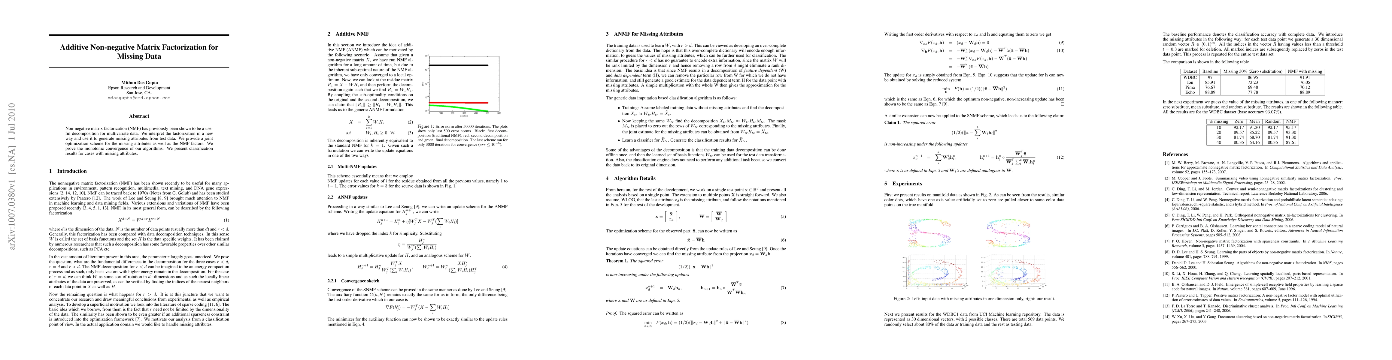 This paper introduces a novel interpretation of non-negative matrix factorization (NMF) to generate missing attributes in multivariate data, employing a joint optimization scheme for both the NMF factors and missing values. The authors demonstrate the monotonic convergence of their algorithm and showcase its effectiveness through classification results with datasets containing missing attributes.