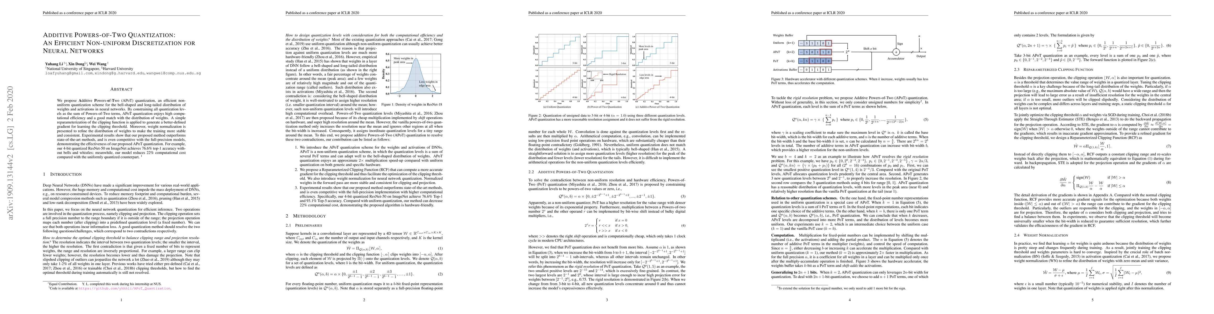 This paper introduces Additive Powers-of-Two (APoT) quantization, a non-uniform scheme for neural network weights and activations that leverages the sum of Powers-of-Two for efficient computation. The method enhances training stability and outperforms state-of-the-art quantization, achieving 76.6% top-1 accuracy on ResNet-50 with 4-bit quantization on ImageNet while reducing computational costs by 22% compared to uniform quantization.