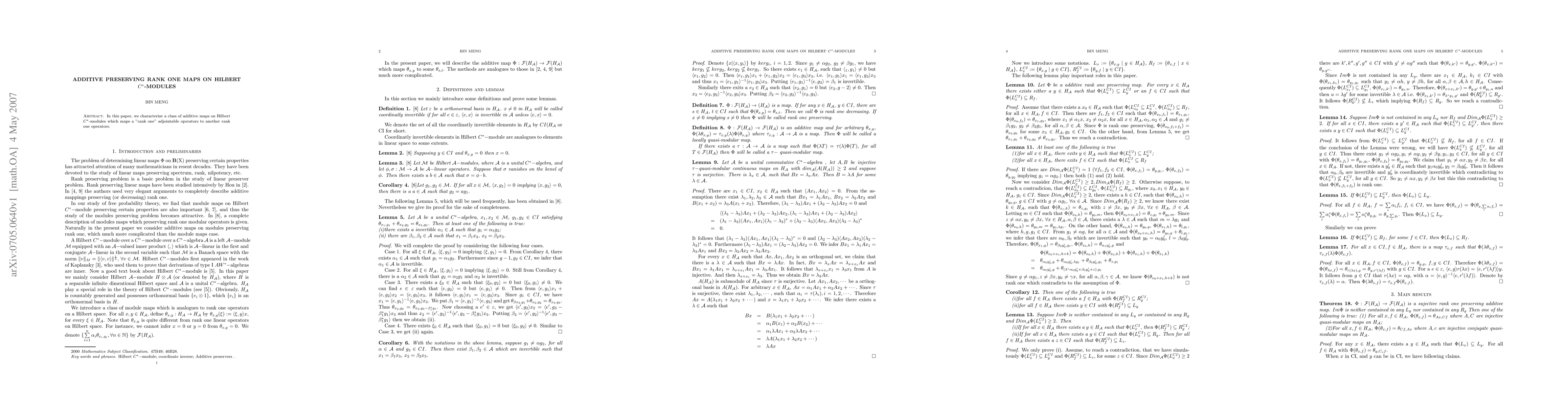Summary: This paper characterizes additive maps on Hilbert $C^\ast$-modules that preserve the rank one property of adjointable operators, identifying the specific conditions under which such maps transform a rank one operator into another rank one operator.