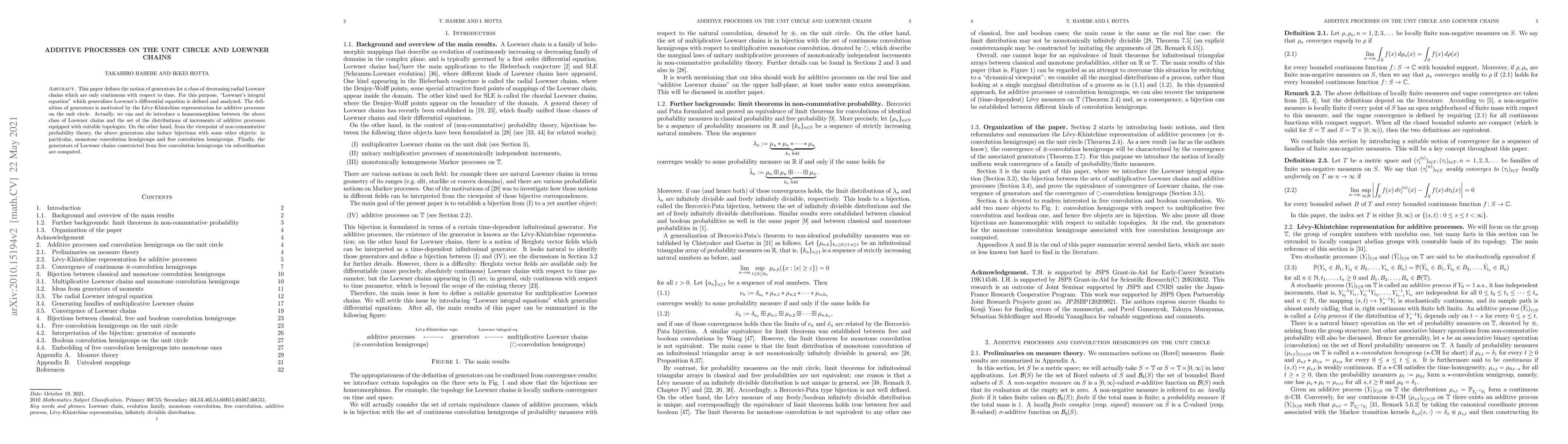 This paper introduces generators for a class of continuous-time decreasing radial Loewner chains, linking them to additive processes on the unit circle via Loewner's integral equation. It also establishes connections between these generators and objects in non-commutative probability theory, such as monotone and free convolution hemigroups.
