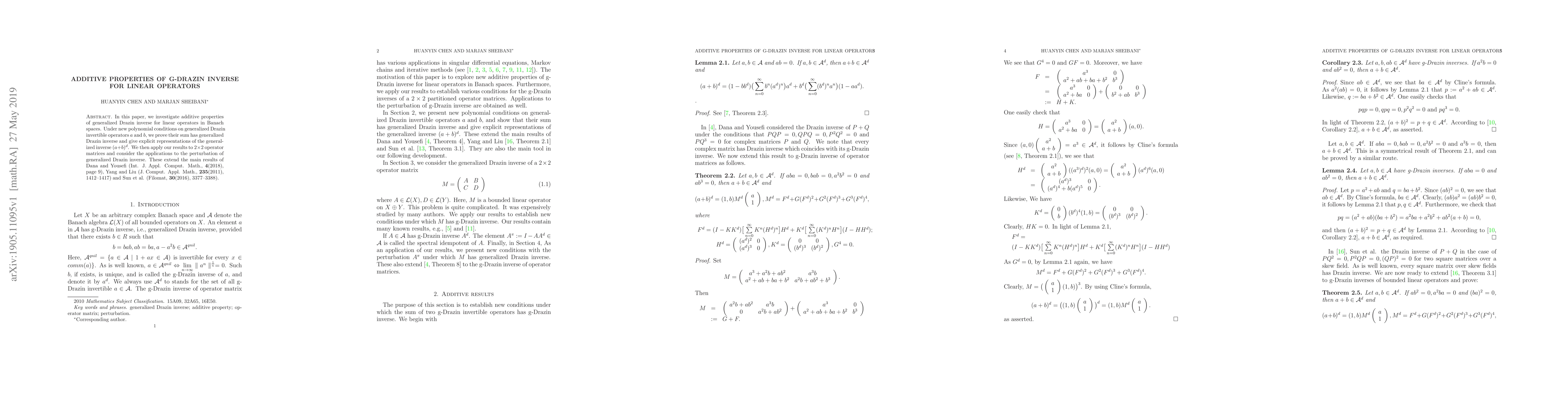 The paper presents novel conditions and proofs for the additive properties of the generalized Drazin inverse of linear operators in Banach spaces, providing explicit formulas and various theorems for the existence and computation of the inverse for operator matrices.