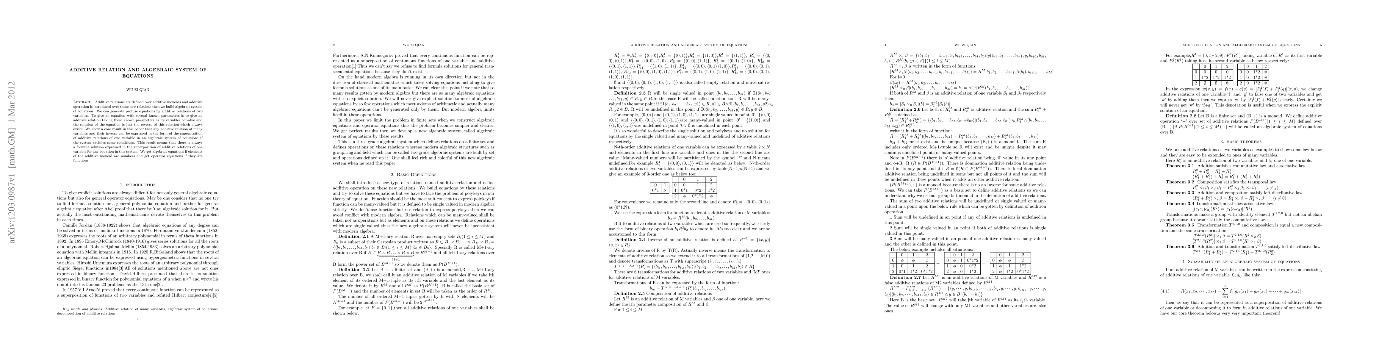 Additive relations are defined over additive monoids and additive operation is introduced over these new relations then we build algebraic system of equations. We can generate profuse equations by additive relations of two variables. To give an equation with several known parameters is to give an additive relation taking these known parameters as its variables or value and the solution of the equation is just the reverse of this relation which always exists. We show a core result in this paper that any additive relation of many variables and their inverse can be expressed in the form of the superposition of additive relations of one variable in an algebraic system of equations if the system satisfies some conditions. This result means that there is always a formula solution expressed in the superposition of additive relations of one variable for any equation in this system. We get algebraic equations if elements of the additive monoid are numbers and get operator equations if they are functions.