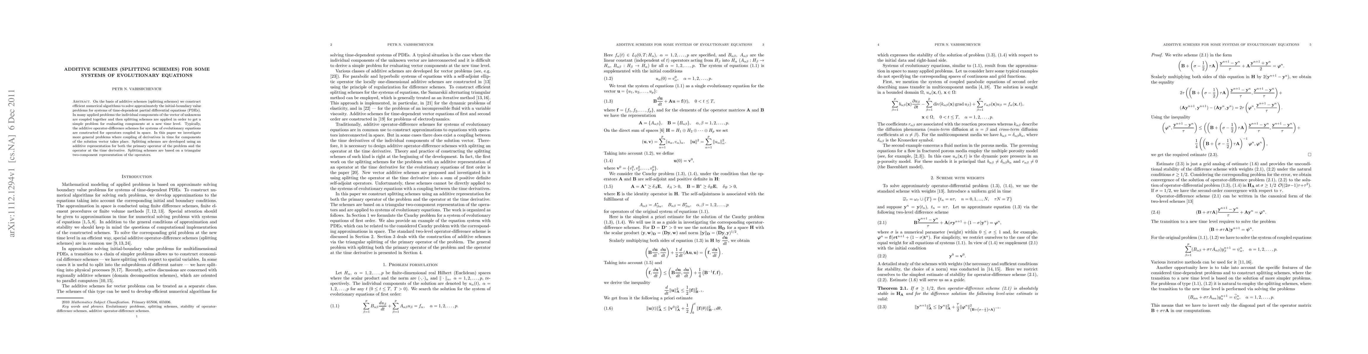 This paper introduces additive schemes for solving systems of evolutionary equations, focusing on time-dependent partial differential equations where components are coupled through derivatives in time.