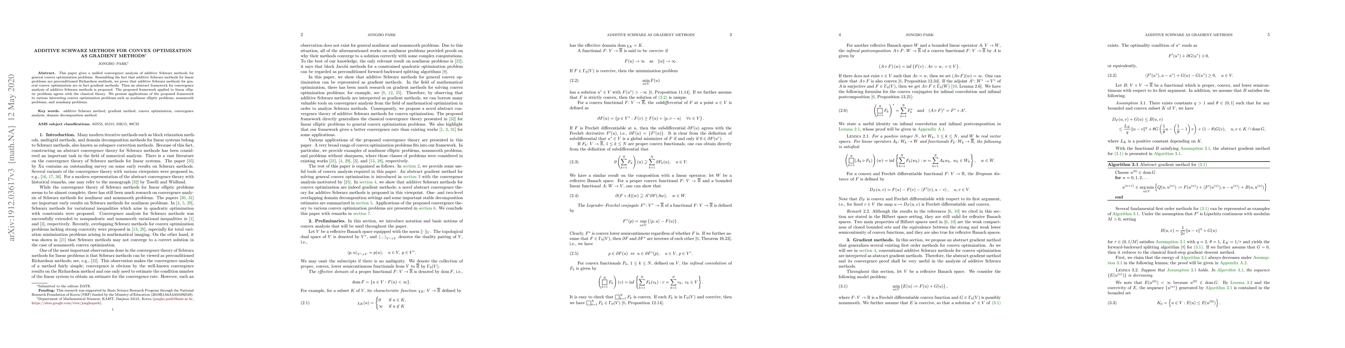 This paper unifies the convergence analysis of additive Schwarz methods for convex optimization, demonstrating their equivalence to gradient methods. An abstract framework for analyzing these methods is proposed and validated against classical theory for linear elliptic problems, with applications to nonlinear, nonsmooth, and nonsharp optimization problems.