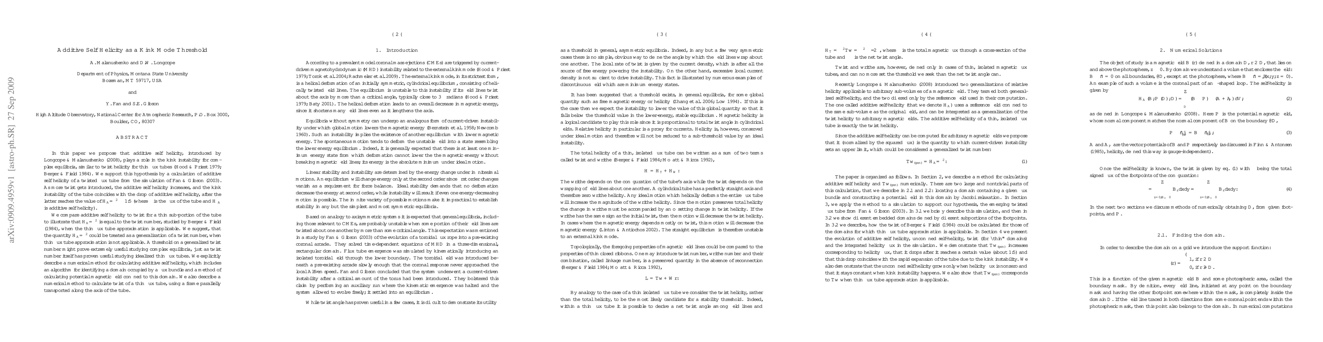 In this paper we propose that additive self helicity, introduced by Longcope and Malanushenko (2008), plays a role in the kink instability for complex equilibria, similar to twist helicity for thin flux tubes (Hood and Priest (1979), Berger and Field (1984)). We support this hypothesis by a calculation of additive self helicity of a twisted flux tube from the simulation of Fan and Gibson (2003). As more twist gets introduced, the additive self helicity increases, and the kink instability of the tube coincides with the drop of additive self helicity, after the latter reaches the value of $H_A/\Phi^2\approx 1.5$ (where $\Phi$ is the flux of the tube and $H_A$ is additive self helicity). We compare additive self helicity to twist for a thin sub-portion of the tube to illustrate that $H_A/\Phi^2$ is equal to the twist number, studied by Berger and Field (1984), when the thin flux tube approximation is applicable. We suggest, that the quantity $H_A/\Phi^2$ could be treated as a generalization of a twist number, when thin flux tube approximation is not applicable. A threshold on a generalized twist number might prove extremely useful studying complex equilibria, just as twist number itself has proven useful studying idealized thin flux tubes. We explicitly describe a numerical method for calculating additive self helicity, which includes an algorithm for identifying a domain occupied by a flux bundle and a method of calculating potential magnetic field confined to this domain. We also describe a numerical method to calculate twist of a thin flux tube, using a frame parallelly transported along the axis of the tube.