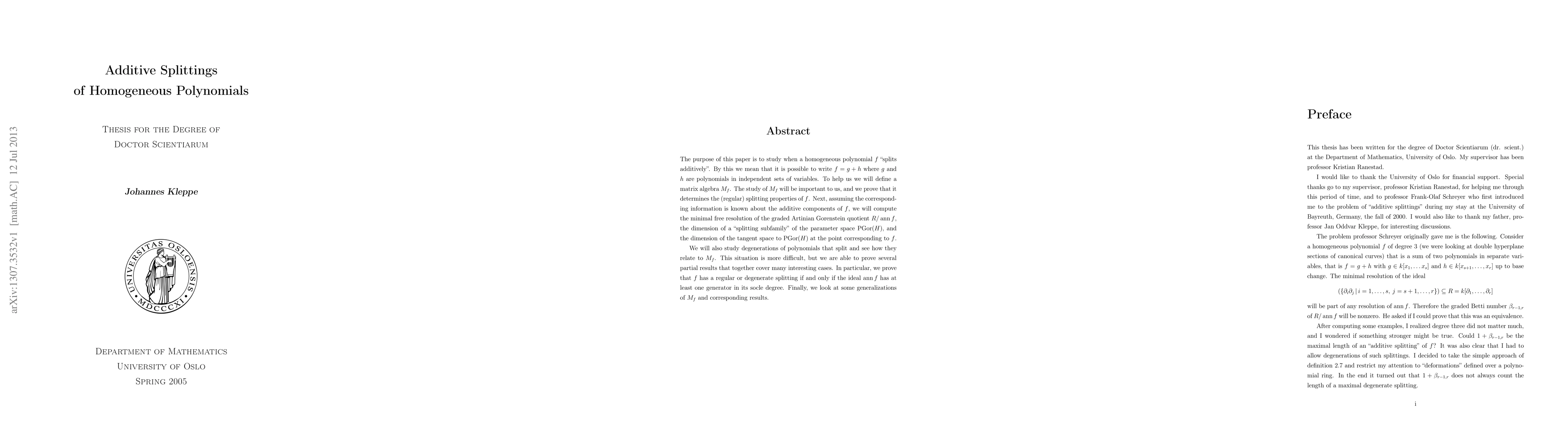 In this thesis we study when a homogeneous polynomial $f$ decomposes or "splits" additively. Up to base change this means that it is possible to write $f = g + h$ where $g$ and $h$ are polynomials in independent sets of variables. This simple idea leads us to define a set $M_f$ of matrices associated to $f$. Surprisingly, $M_f$ turns out to be a commutative matrix algebra when $deg f \ge 3$. We show how all (regular) splittings $f = g_1 + ... + g_n$ can be computed from $M_f$. Next we show how to find the minimal free resolution of the graded Artinian Gorenstein quotient $R/\ann f$, assuming the minimal free resolutions of its additive components $R/\ann g_i$ are known. From this we get simple formulas for the Hilbert function $H$ and the graded Betti numbers of $R/\ann f$. We may use this to compute the dimension of a "splitting subfamily" of the parameter space $\PGor (H)$. Its closure is quite often an irreducible component of $\PGor (H)$. We will also study degenerations of polynomials that split and see how they relate to $M_f$. This situation is more difficult, but we are able to prove several partial results that together cover many interesting cases. In particular, we prove that $f$ has a regular or degenerate splitting if and only if the ideal $\ann f$ has at least one generator in its socle degree. Finally, we look at some generalizations of $M_f$.