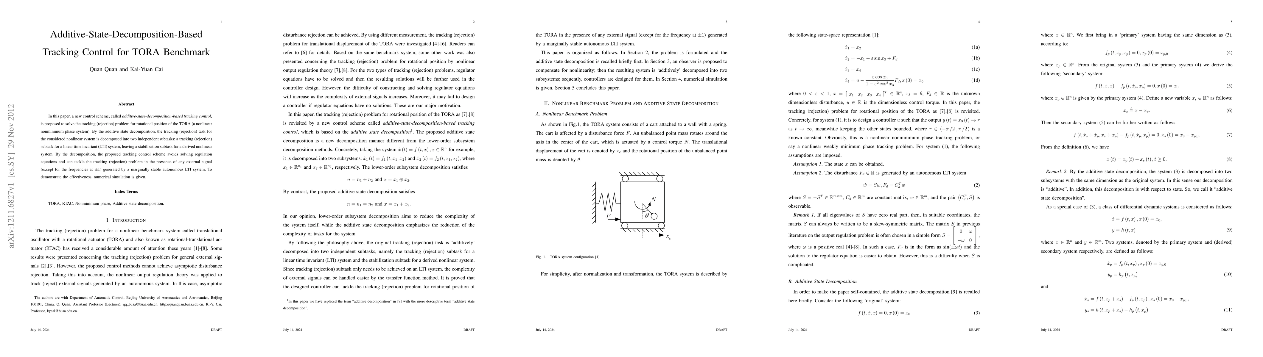 A new control scheme, additive state decomposition tracking control, is proposed to solve a tracking problem for a nonminimum phase system using a linear time-invariant subtask and a stabilization subtask for a derived nonlinear system.