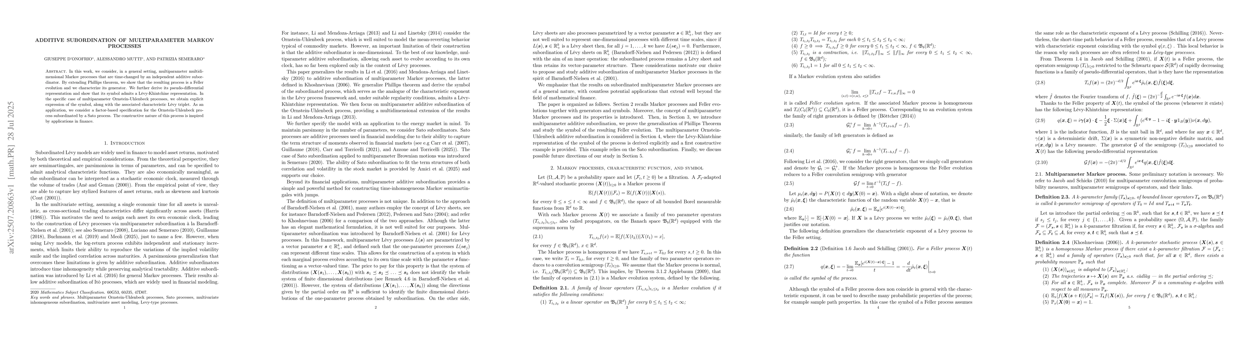 In this work, we consider, in a general setting, multiparameter multidimensional Markov processes that are time-changed by an independent additive subordinator. By extending Phillips theorem, we show that the resulting process is a Feller evolution and we characterize its generator. We further derive its pseudo-differential representation and show that its symbol admits a L\'evy-Khintchine representation. In the specific case of multiparameter Ornstein-Uhlenbeck processes, we obtain explicit expression of the symbol, along with the associated characteristic L\'evy triplet. As an application, we consider a factor-based specification for the Ornstein-Uhlenbeck process subordinated by a Sato process. The constructive nature of this process is inspired by applications in finance.