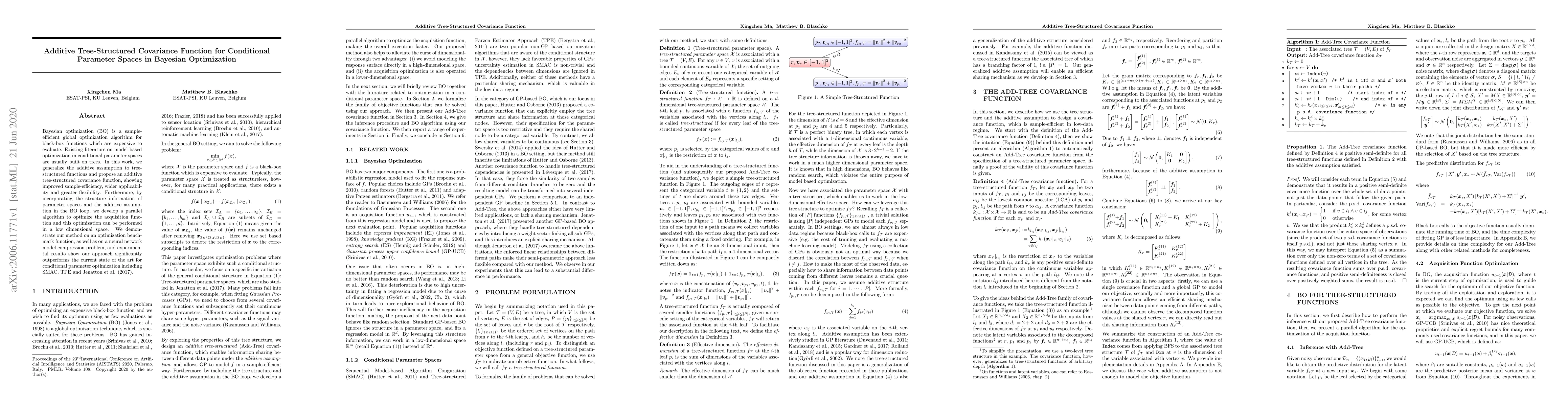 This paper proposes an additive tree-structured covariance function for Bayesian optimization in conditional parameter spaces, demonstrating improved sample-efficiency and flexibility. The method optimizes the acquisition function in a low-dimensional space using a parallel algorithm, outperforming existing approaches in benchmark tests and neural network model compression.