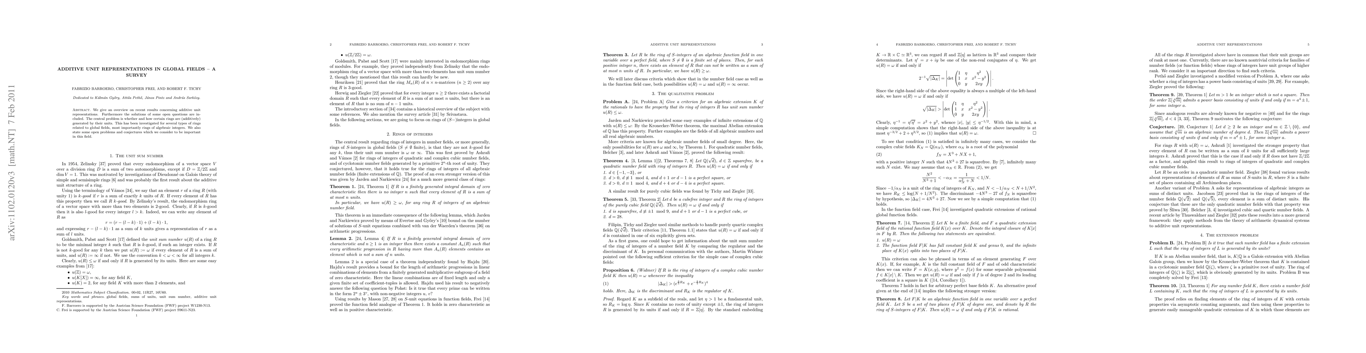 We give an overview on recent results concerning additive unit representations. Furthermore the solutions of some open questions are included. The central problem is whether and how certain rings are (additively) generated by their units. This has been investigated for several types of rings related to global fields, most importantly rings of algebraic integers. We also state some open problems and conjectures which we consider to be important in this field.