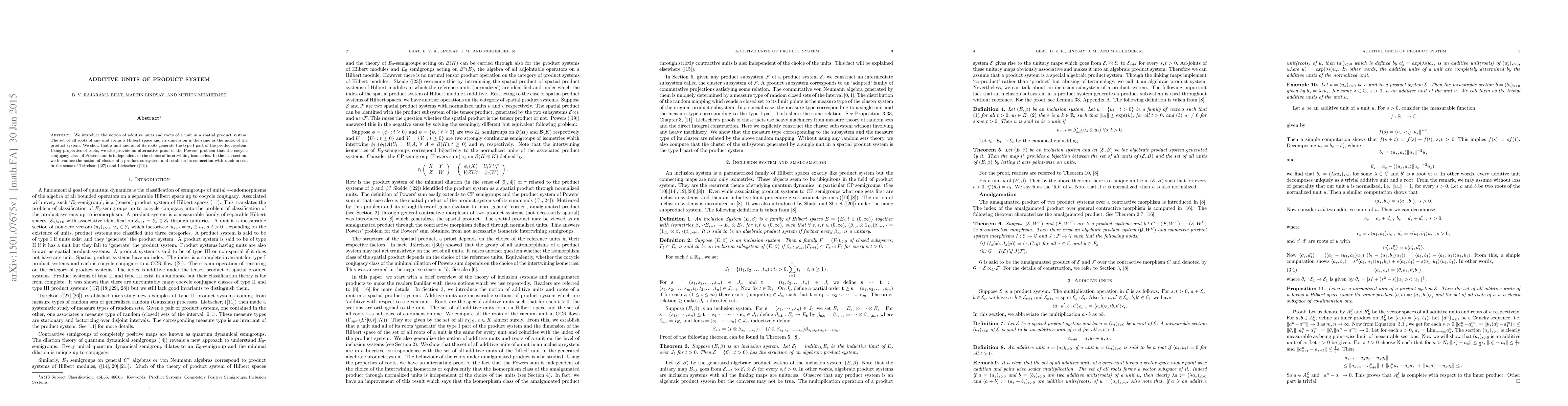 This paper introduces the concept of additive units and their roots in spatial product systems, demonstrating that the set of roots forms a Hilbert space with a dimension equal to the product system's index. It also proves that units and their roots generate the type I part of the system and provides an alternative proof of Powers' problem regarding cocycle conjugacy. The paper concludes by discussing clusters of product subsystems and their connection to random sets.