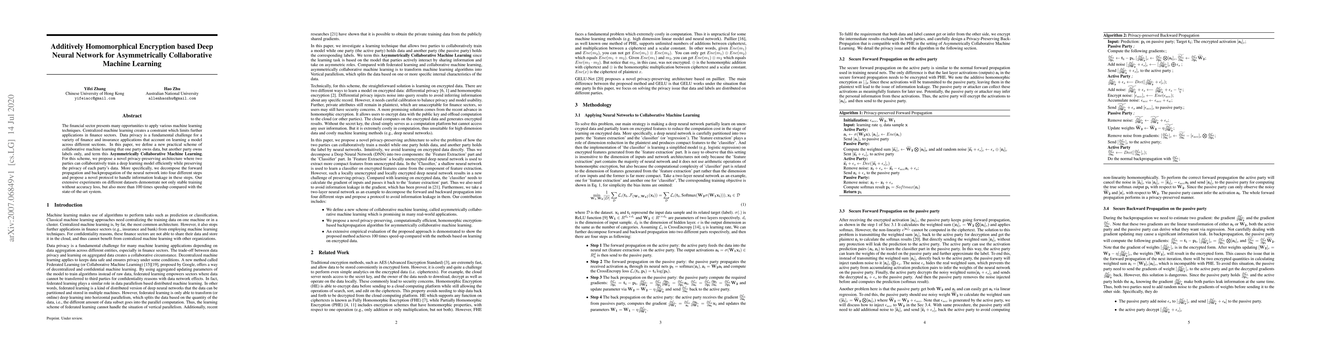 This paper introduces a novel additively homomorphic encryption-based deep neural network architecture for Asymmetrically Collaborative Machine Learning, enabling two parties to train a model collaboratively while preserving data privacy, with experiments showing stable training and significant speedups.