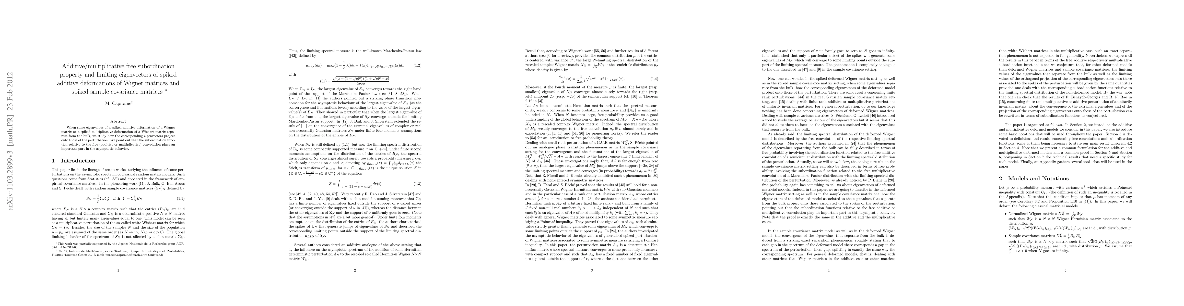 When some eigenvalues of a spiked multiplicative resp. additive deformation model of a Hermitian Wigner matrix resp. a sample covariance matrix separate from the bulk, we study how the corresponding eigenvectors project onto those of the perturbation. We point out that the inverse of the subordination function relative to the free additive resp. multiplicative convolution plays an important part in the asymptotic behavior.