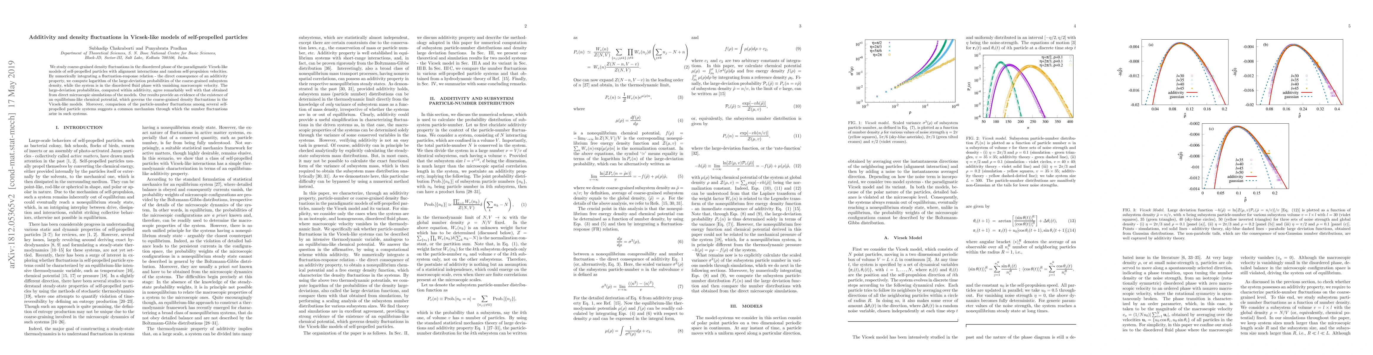 We study coarse-grained density fluctuations in the disordered phase of the paradigmatic Vicsek-like models of self-propelled particles with alignment interactions and random self-propulsion velocities. By numerically integrating a fluctuation-response relation - the direct consequence of an additivity property, we compute logarithm of the large-deviation probabilities of the coarse-grained subsystem density, while the system is in the disordered fluid phase with vanishing macroscopic velocity. The large-deviation probabilities, computed within additivity, agree remarkably well with that obtained from direct microscopic simulations of the models. Our results provide an evidence of the existence of an equilibrium-like chemical potential, which governs the coarse-grained density fluctuations in the Vicsek-like models. Moreover, comparison of the particle-number fluctuations among several self-propelled particle systems suggests a common mechanism through which the number fluctuations arise in such systems.