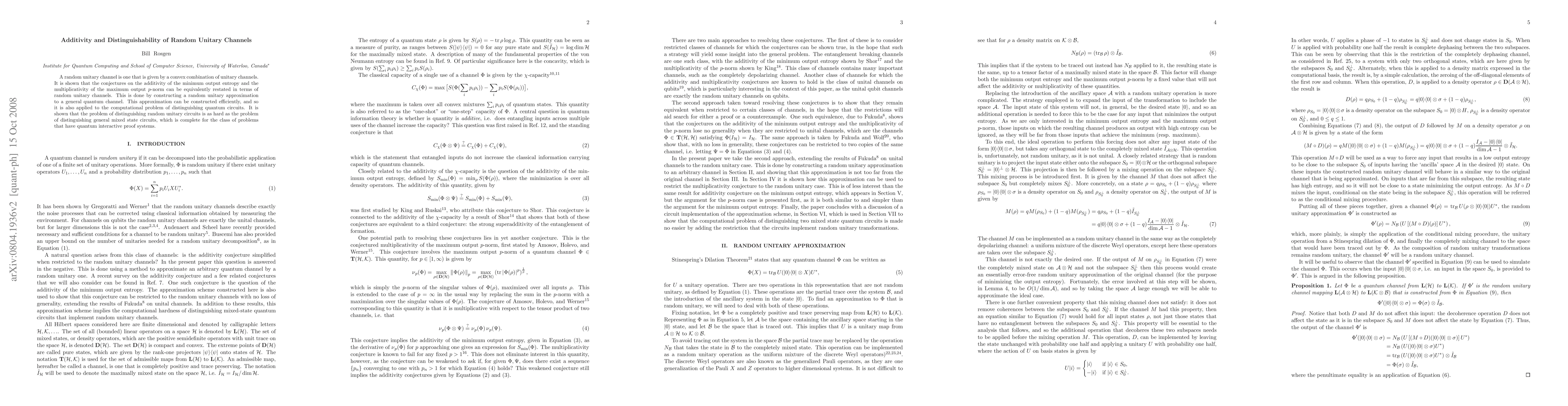 A random unitary channel is one that is given by a convex combination of unitary channels. It is shown that the conjectures on the additivity of the minimum output entropy and the multiplicativity of the maximum output $p$-norm can be equivalently restated in terms of random unitary channels. This is done by constructing a random unitary approximation to a general quantum channel. This approximation can be constructed efficiently, and so it is also applied to the computational problem of distinguishing quantum circuits. It is shown that the problem of distinguishing random unitary circuits is as hard as the problem of distinguishing general mixed state circuits, which is complete for the class of problems that have quantum interactive proof systems.
