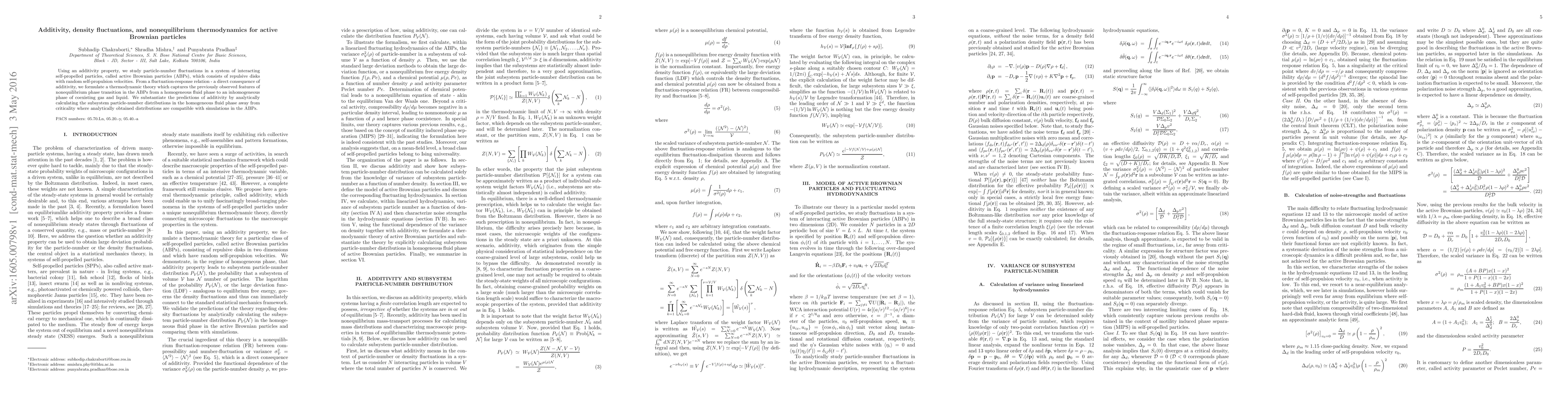 Using an additivity property, we study particle-number fluctuations in a system of interacting self-propelled particles, called active Brownian particles (ABPs), which consists of repulsive disks with random self-propulsion velocities. From a fluctuation-response relation - a direct consequence of additivity, we formulate a thermodynamic theory which captures the previously observed features of nonequilibrium phase transition in the ABPs from a homogeneous fluid phase to an inhomogeneous phase of coexisting gas and liquid. We substantiate the predictions of additivity by analytically calculating the subsystem particle-number distributions in the homogeneous fluid phase away from criticality where analytically obtained distributions are compatible with simulations in the ABPs.