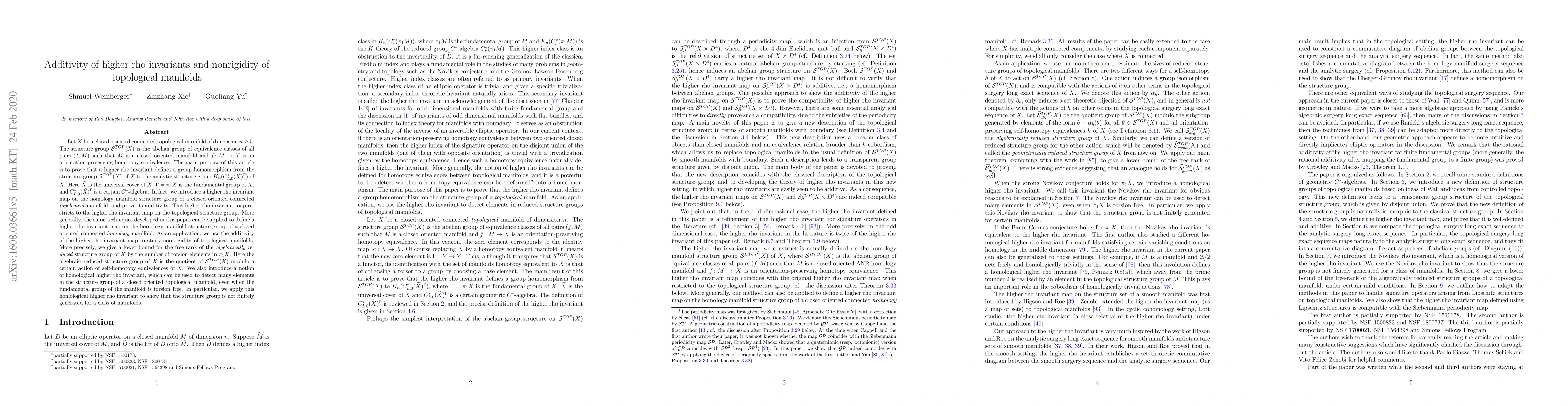 This paper proves the additivity of higher rho invariants for closed oriented topological manifolds and uses this to demonstrate non-rigidity, showing that the structure group's free rank is bounded by the number of torsion elements in the manifold's fundamental group. It also introduces a homological higher rho invariant to detect elements in the structure group even when the fundamental group is torsion-free.