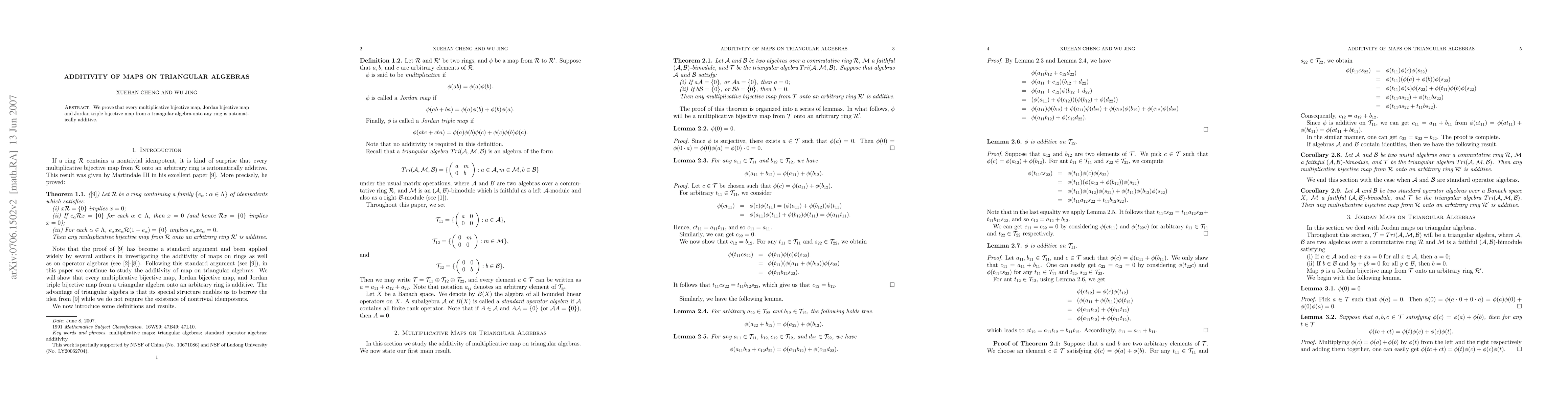We prove that every multiplicative bijective map, Jordan bijective map, and Jordan triple bijective map from a triangular algebra onto any ring is automatically additive.