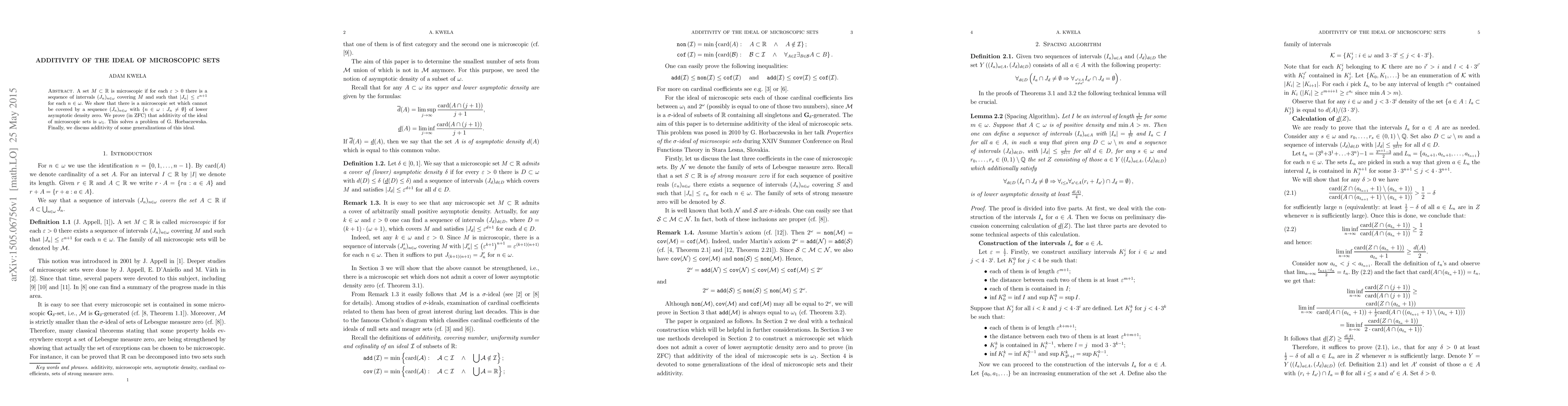 Researchers prove that a microscopic set exists that cannot be covered by an interval sequence of low density, while also showing that additivity of the ideal of microscopic sets is θ_1 in ZFC.
