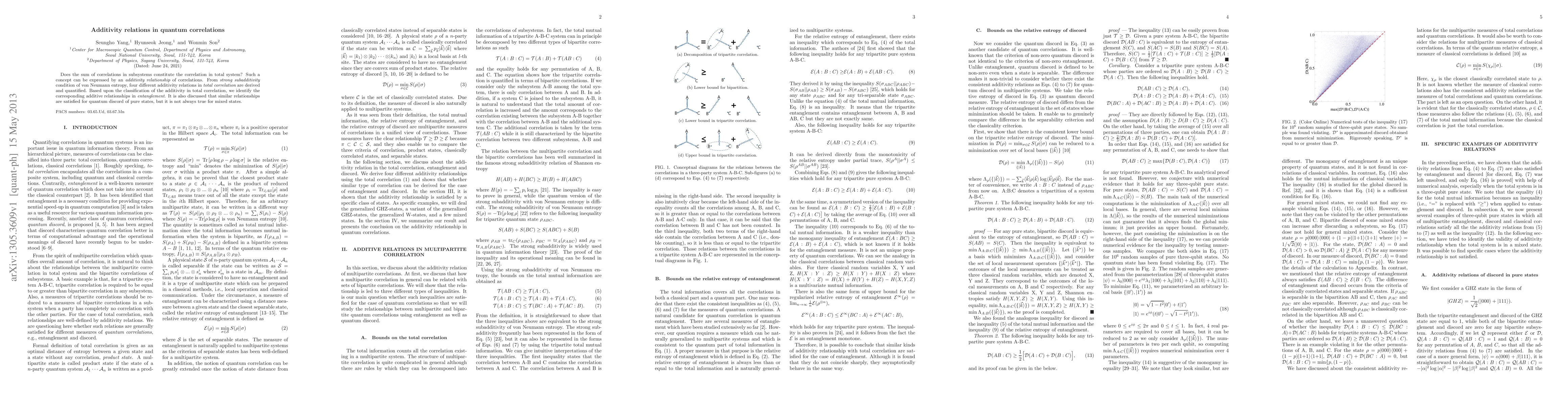 The paper establishes additivity relations for total correlation and identifies corresponding relationships in entanglement and quantum discord, extending previous work on von Neumann entropy and strong subadditivity.