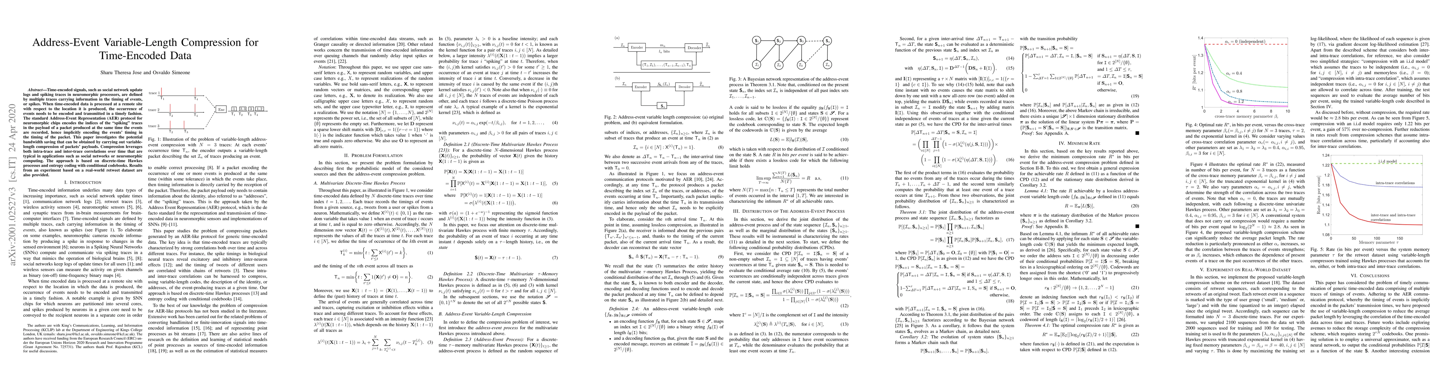 Time-encoded signals, such as social network update logs and spiking traces in neuromorphic processors, are defined by multiple traces carrying information in the timing of events, or spikes. When time-encoded data is processed at a remote site with respect to the location it is produced, the occurrence of events needs to be encoded and transmitted in a timely fashion. The standard Address-Event Representation (AER) protocol for neuromorphic chips encodes the indices of the "spiking" traces in the payload of a packet produced at the same time the events are recorded, hence implicitly encoding the events' timing in the timing of the packet. This paper investigates the potential bandwidth saving that can be obtained by carrying out variable-length compression of packets' payloads. Compression leverages both intra-trace and inter-trace correlations over time that are typical in applications such as social networks or neuromorphic computing. The approach is based on discrete-time Hawkes processes and entropy coding with conditional codebooks. Results from an experiment based on a real-world retweet dataset are also provided.