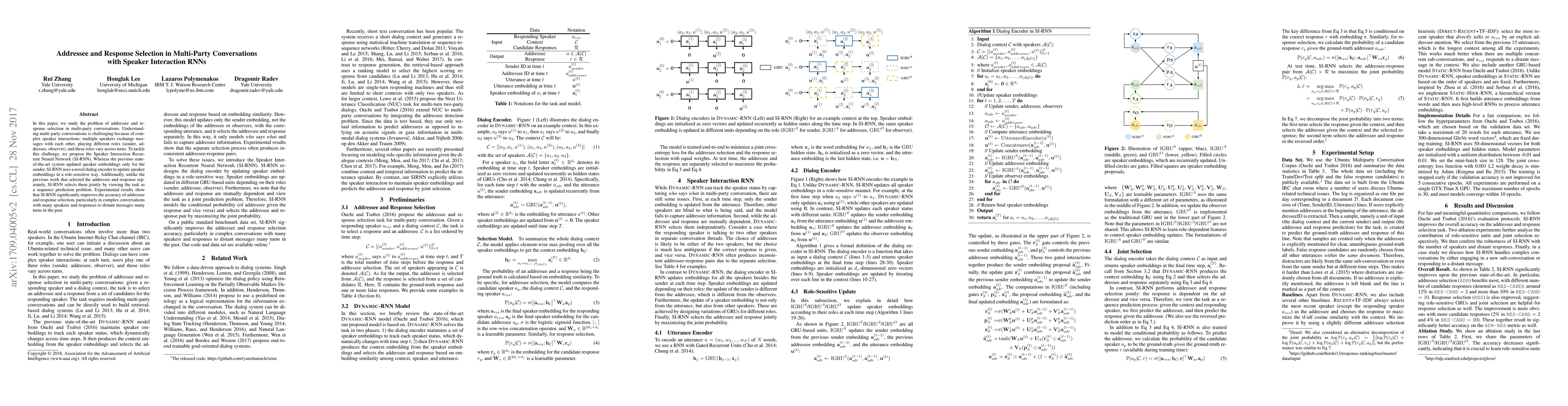 This paper proposes the Speaker Interaction Recurrent Neural Network (SI-RNN) to tackle the complex problem of addressee and response selection in multi-party conversations. SI-RNN updates speaker embeddings in a role-sensitive manner and jointly selects the addressee and response, significantly improving accuracy in complex conversations.