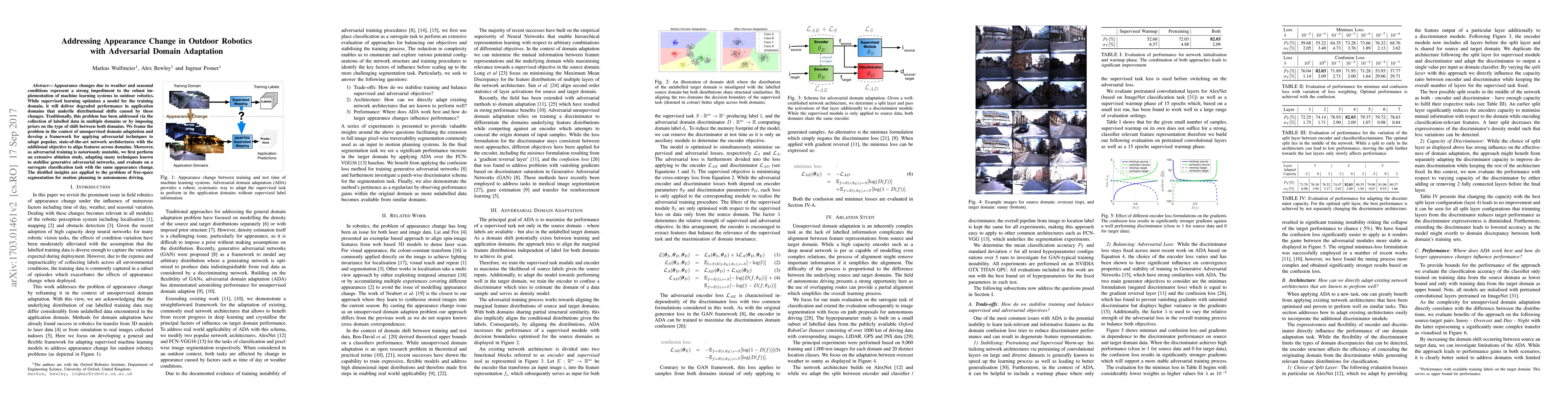 Appearance changes due to weather and seasonal conditions represent a strong impediment to the robust implementation of machine learning systems in outdoor robotics. While supervised learning optimises a model for the training domain, it will deliver degraded performance in application domains that underlie distributional shifts caused by these changes. Traditionally, this problem has been addressed via the collection of labelled data in multiple domains or by imposing priors on the type of shift between both domains. We frame the problem in the context of unsupervised domain adaptation and develop a framework for applying adversarial techniques to adapt popular, state-of-the-art network architectures with the additional objective to align features across domains. Moreover, as adversarial training is notoriously unstable, we first perform an extensive ablation study, adapting many techniques known to stabilise generative adversarial networks, and evaluate on a surrogate classification task with the same appearance change. The distilled insights are applied to the problem of free-space segmentation for motion planning in autonomous driving.