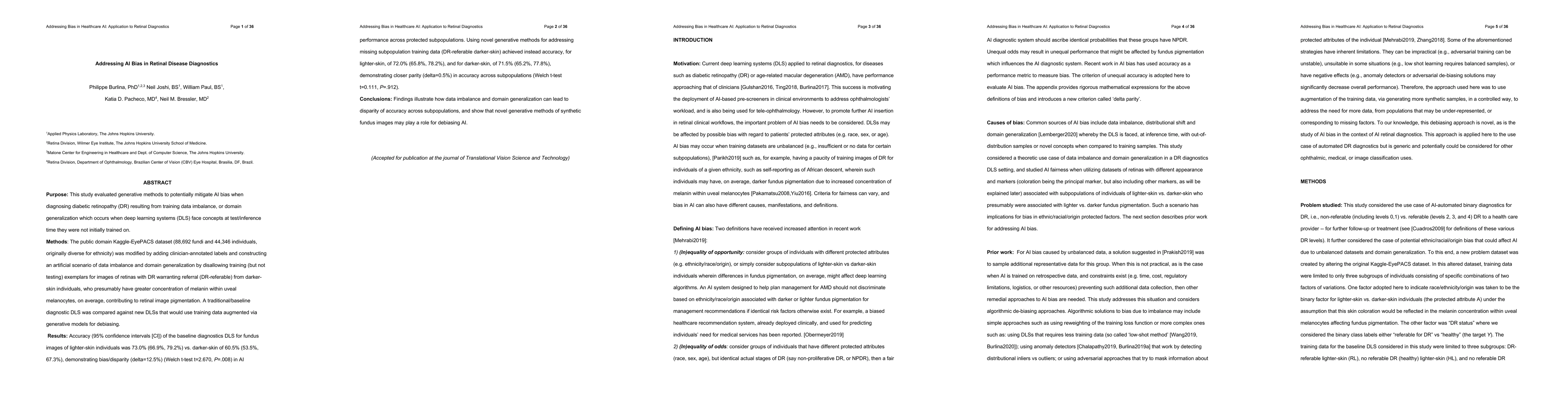 This study evaluated generative methods to potentially mitigate AI bias when diagnosing diabetic retinopathy (DR) resulting from training data imbalance, or domain generalization which occurs when deep learning systems (DLS) face concepts at test/inference time they were not initially trained on. The public domain Kaggle-EyePACS dataset (88,692 fundi and 44,346 individuals, originally diverse for ethnicity) was modified by adding clinician-annotated labels and constructing an artificial scenario of data imbalance and domain generalization by disallowing training (but not testing) exemplars for images of retinas with DR warranting referral (DR-referable) and from darker-skin individuals, who presumably have greater concentration of melanin within uveal melanocytes, on average, contributing to retinal image pigmentation. A traditional/baseline diagnostic DLS was compared against new DLSs that would use training data augmented via generative models for debiasing. Accuracy (95% confidence intervals [CI]) of the baseline diagnostics DLS for fundus images of lighter-skin individuals was 73.0% (66.9%, 79.2%) vs. darker-skin of 60.5% (53.5%, 67.3%), demonstrating bias/disparity (delta=12.5%) (Welch t-test t=2.670, P=.008) in AI performance across protected subpopulations. Using novel generative methods for addressing missing subpopulation training data (DR-referable darker-skin) achieved instead accuracy, for lighter-skin, of 72.0% (65.8%, 78.2%), and for darker-skin, of 71.5% (65.2%,77.8%), demonstrating closer parity (delta=0.5%) in accuracy across subpopulations (Welch t-test t=0.111, P=.912). Findings illustrate how data imbalance and domain generalization can lead to disparity of accuracy across subpopulations, and show that novel generative methods of synthetic fundus images may play a role for debiasing AI.