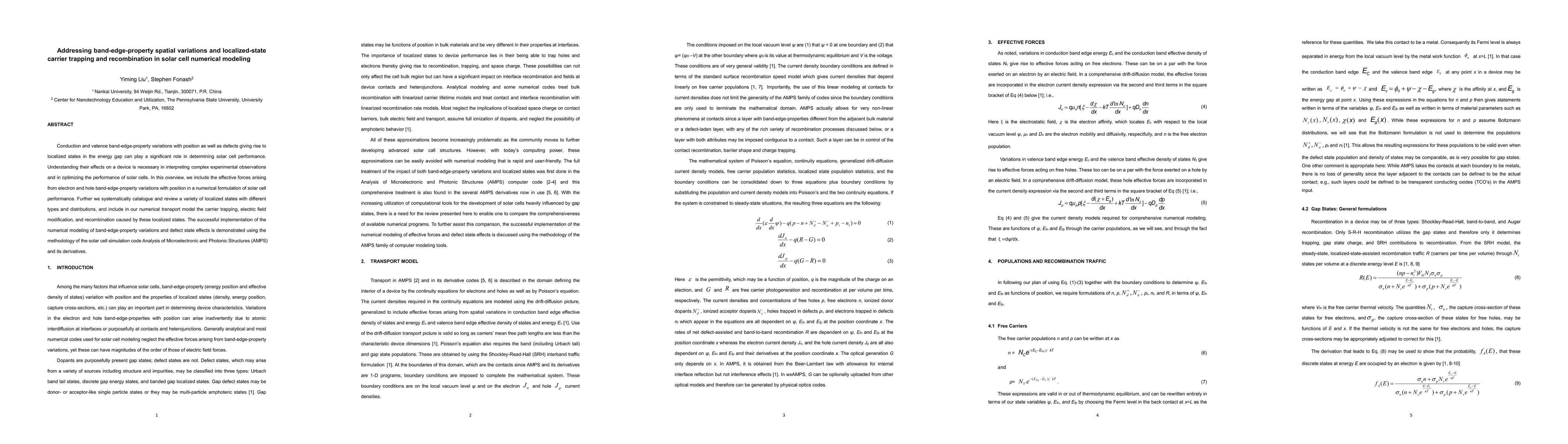 Conduction and valence band-edge-property variations with position as well as defects giving rise to localized states in the energy gap can play a significant role in determining solar cell performance. Understanding their effects on a device is necessary in interpreting complex experimental observations and in optimizing the performance of solar cells. In this overview, we include the effective forces arising from electron and hole band-edge-property variations with position in a numerical formulation of solar cell performance. Further we systematically catalogue and review a variety of localized states with different types and distributions, and include in our numerical transport model the carrier trapping, electric field modification, and recombination caused by these localized states. The successful implementation of the numerical modeling of band-edge-property variations and defect state effects is demonstrated using the methodology of the solar cell simulation code Analysis of Microelectronic and Photonic Structures (AMPS) and its derivatives.