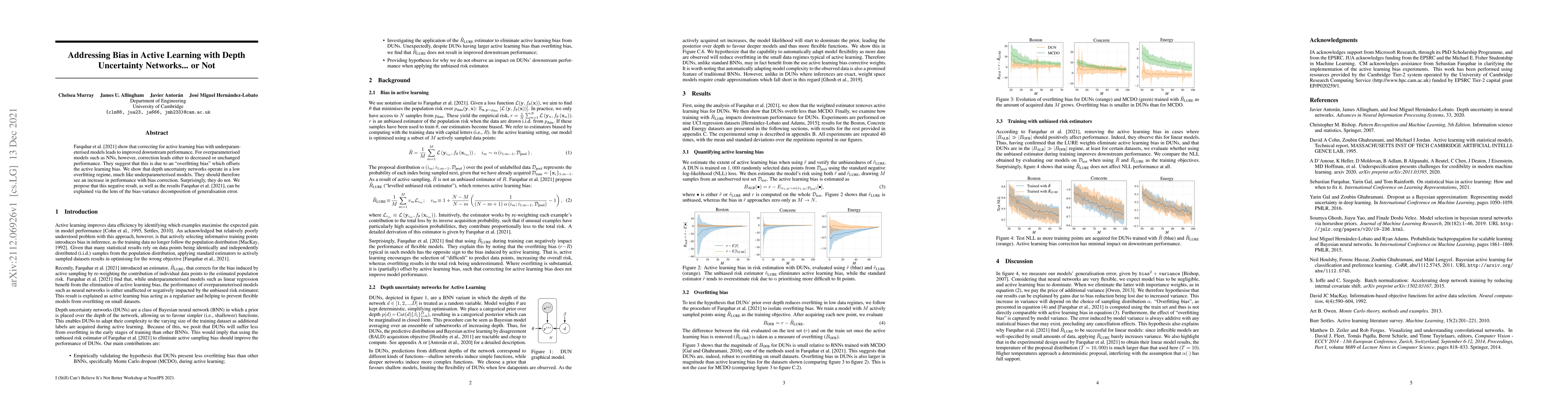 Farquhar et al. [2021] show that correcting for active learning bias with underparameterised models leads to improved downstream performance. For overparameterised models such as NNs, however, correction leads either to decreased or unchanged performance. They suggest that this is due to an "overfitting bias" which offsets the active learning bias. We show that depth uncertainty networks operate in a low overfitting regime, much like underparameterised models. They should therefore see an increase in performance with bias correction. Surprisingly, they do not. We propose that this negative result, as well as the results Farquhar et al. [2021], can be explained via the lens of the bias-variance decomposition of generalisation error.